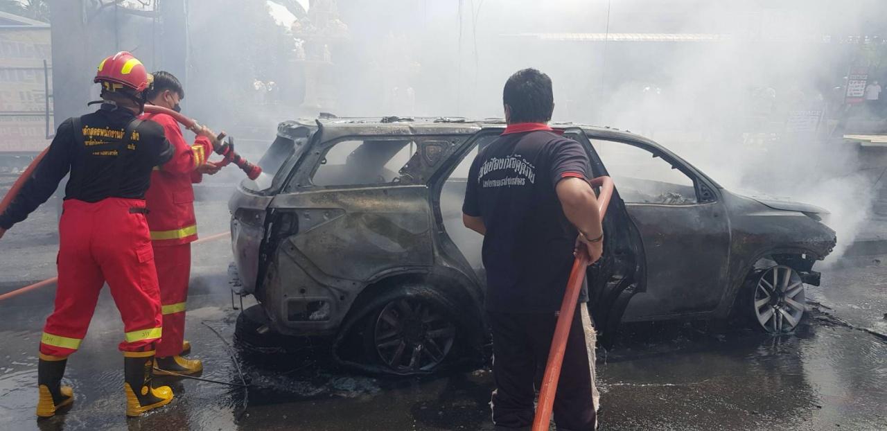 ะอบต.ท่าทราย รวม 5 คัน ช่วยกันฉีดสกัดเพลิงที่กำลังลุกโหมรถยนต์ พร้อมมีเสียงระเบิดขึ้นอย่างต่อเนื่องจากถังน้ำมันรถและยางรถ ใช้เวลาดับประมาณครึ่งชั่วโมง เพลิงจึงสงบ พบรถยนต์นั่งส่วนบุคคลยี่ห้อโตโยต้าฟอร์จูนเนอร์ สีขาว ไม่ทราบหมายเลขทะเบียนไหม้วอดทั้งคัน ไม่มีผู้ได้รับบาดเจ็บ