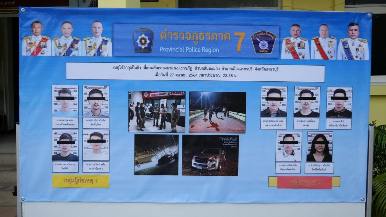 สอบสวนทราบว่า ผู้ที่ร่วมกันก่อเหตุมีด้วยกัน จำนวน 2 กลุ่ม คือ “กลุ่มหน้าลาบ” ที่นำโดย นายจิระธนินทร์ หรือเรด นาคหมื่นไวย์ กับพวก ประมาณ 10 คน และ “กลุ่มไร่กล้วย” ที่นำโดยนายภานุวัฒน์ หรือเกมส์ น้อยคง กับพวกประมาณ 15 คน โดยทั้ง 2 กลุ่มมีเรื่องบาดหมางกัน ท้าทายกันผ่านทางเฟซบุ๊ก และมีการนัดมาพบกันบริเวณที่เกิดเหตุ เมื่อถึงที่เกิดเหตุมีการพูดจาด่าทอ และท้าทายกัน กระทั่งเกิดชกต่อยกันและมีเสียงปืนดังขึ้น จากนั้นทั้ง 2 ฝ่ายจึงเกิดการยิงโต้ตอบใส่กันไปมาหลายสิบนัด ชุดสืบสวน สภ.เมืองเพชรบุรี จึงรวบรวมพยานหลักฐานจากกล้องวงจรปิด ขอหมายจับจากศาลจังหวัดเพชรบุรี จับกุมผู้ต้องหาที่ปรากฏภาพชัดในคลิปวิดีโอวงจรปิด เบื้องต้นจำนวน 4 คน