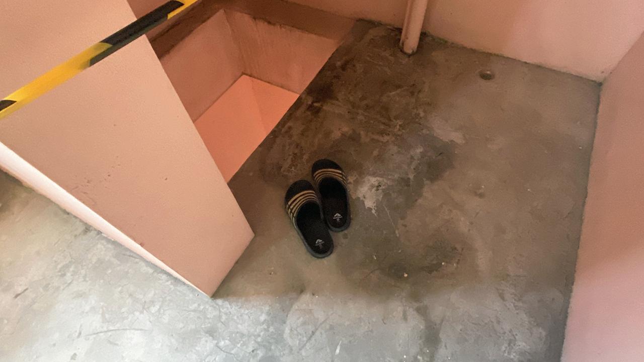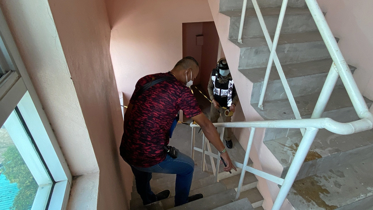 ตำรวจหาหลักฐานบนบันไดหนีไฟ “อสมากร เรสซิเด้นซ์” อ.เมืองชลบุรี หลังนายอุดมธัญญ์ จันทร์ศักดิ์ วิศวกร พลัดตกช่องทิ้งขยะชั้น 7 ไม่มีประตูกั้น ร่วงลงมาตายที่ชั้นล่าง คาดเมาคิดว่าเดินเข้าห้องพัก.