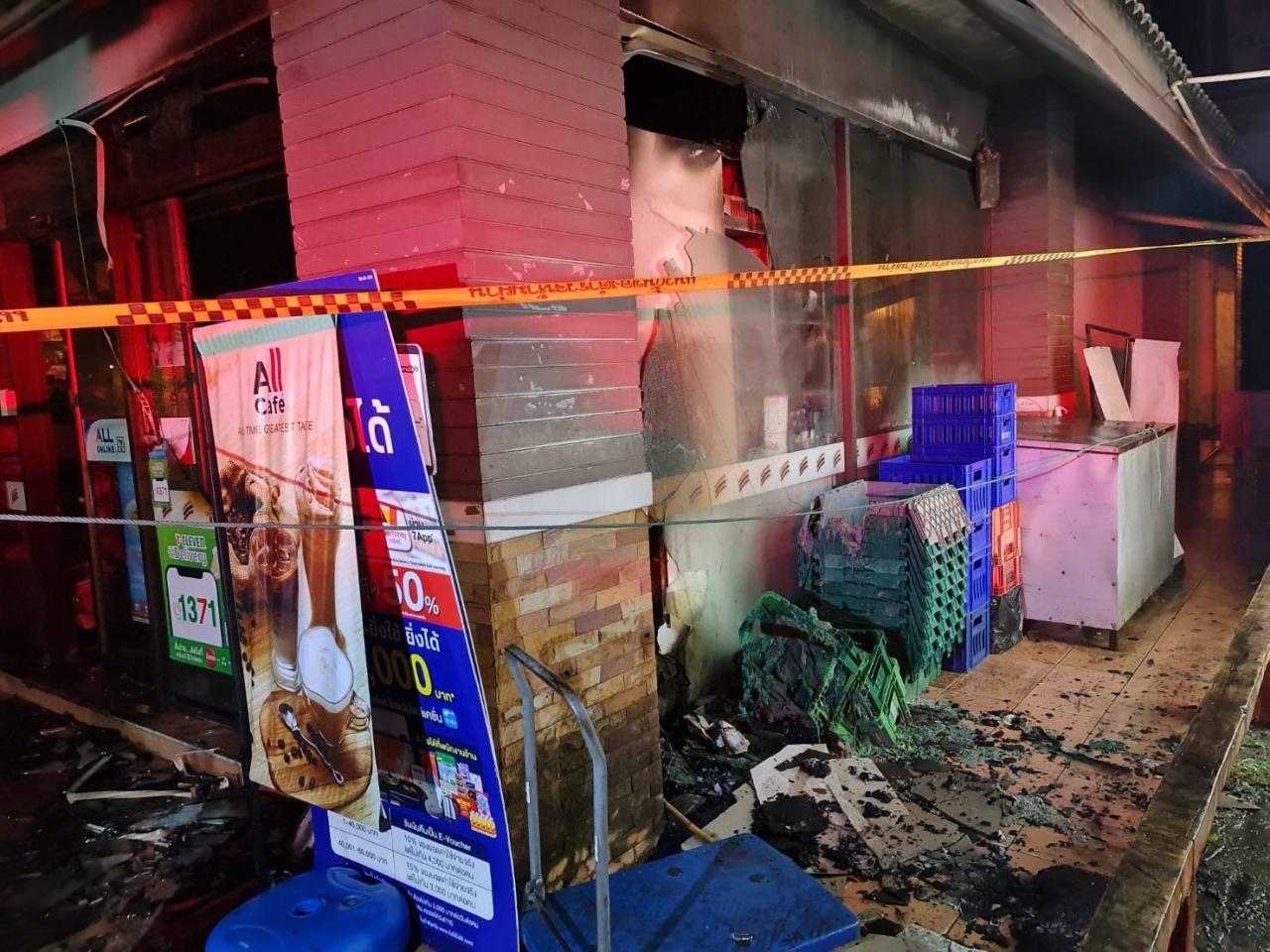 พ.ต.อ.เกรียงศักดิ์ วงศ์อุทัย รักษาการ ผกก.สภ.แม่แตง ระบุว่า จากการสอบปากคำพนักงานร้านสะดวกซื้อได้ข้อมูลว่า ช่วงเกิดเหตุมีพนักงานหญิงอยู่ในร้าน 2 คน คนร้ายเป็นชาย สูงประมาณ 170 เซนติเมตร สวมหน้ากากอนามัยปิดบังใบหน้า ขี่รถจักรยานยนต์มาจอดหน้าร้าน เดินตรงเข้ามาในร้าน ก่อนจะชักมีดยาวออกมาข่มขู่ให้พนักงานเข้าไปอยู่ในห้องเก็บของหลังร้าน จังหวะนั้นคนร้ายได้ค้นเอาเงินในลิ้นชักโต๊ะได้ไปประมาณ 1,000 กว่าบาท แล้วใช้น้ำมันที่เตรียมมาราดลงบนเคาน์เตอร์ชำระเงินและจุดไฟเผาจนเกิดเปลวเพลิงลุกไหม้ ขณะที่คนร้ายกำลังเผลอ พนักงานได้วิ่งหนีออกมาทางหน้าร้าน พร้อมกับร้องขอความช่วยเหลือ ก่อนที่คนร้ายจะขี่รถจักรยานยนต์หลบหนีไป