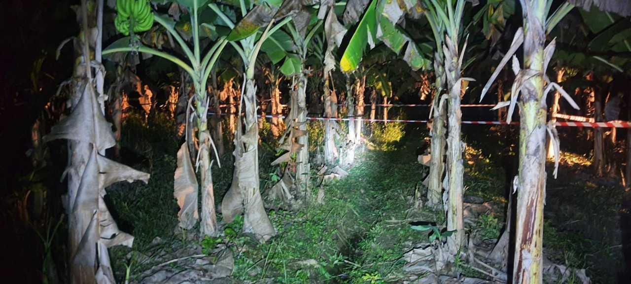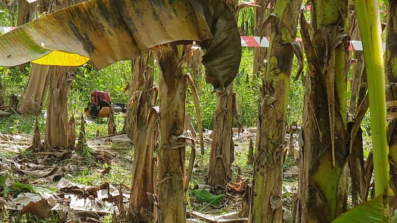 คืบหน้าเมื่อเวลา 10.00 น.วันที่ 9 พ.ย.64 ผู้สื่อข่าวได้ลงพื้นที่สวนกล้วยหอมที่เกิดเหตุ ซึ่งทางตำรวจเชือกมากั้นที่เกิดเหตุไว้เพื่อไม่ให้มีใครเข้าไปในพื้นที่ด้วยที่มีเครื่องตัดหญ้าของนายศักดิ์คนเจ็บอยู่กลางสวน