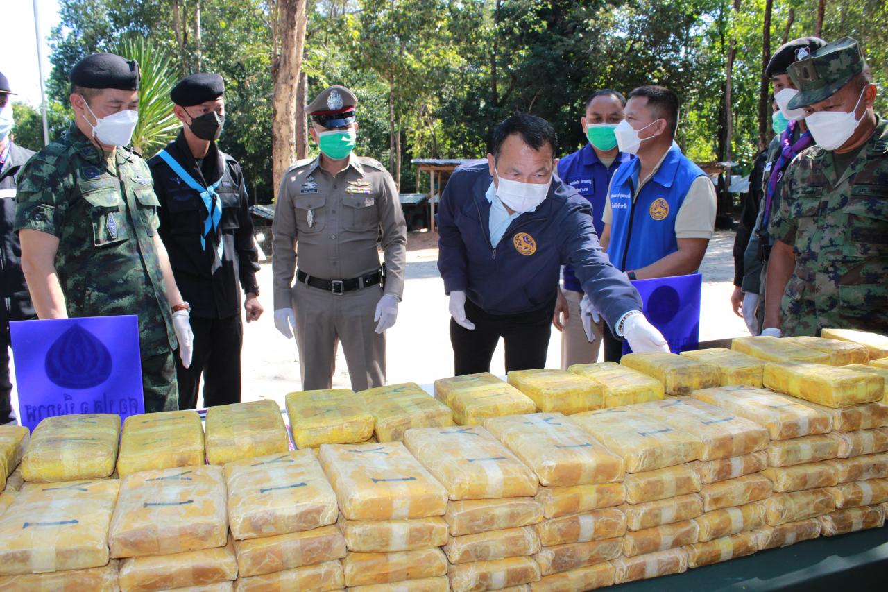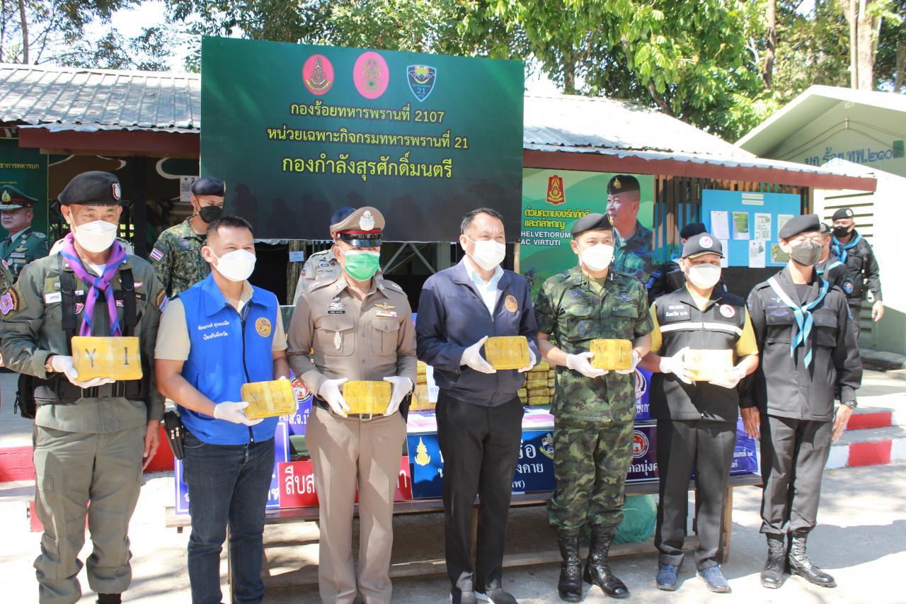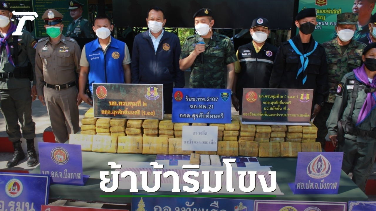 เมื่อเวลา 13.00 น. วันที่ 26 พ.ย.64 ที่ฐานปฏิบัติการทหารพรานที่ 2107 บ้านภูสวาท ต.หนองเดิ่น อ.บุ่งคล้า จ.บึงกาฬ พ.อ.ปฏิวัติ ชื่นศรี รองผู้บัญชาการกองบังคับการควบคุมที่ 2 กองกำลังสุรศักดิ์มนตรี ร่วมกับ นายอดุลย์ นามแสงนายอำเภอบุ่งคล้า พ.อ.อำนาจ กระโทกนอก สัสดีจังหวัดบึงกาฬ และหน่วยงานความมั่นคงในพื้นที่ แถลงข่าวผลการตรวจยึดยาบ้า จำนวน 5 กระสอบ ประมาณ 986,000 เม็ด มูลค่ากว่า 90 ล้านบาท หลังทหารพรานที่ 2107 ยึดได้บริเวณริมฝั่งแม่น้ำโขงบริเวณปากห้วยขามเปี้ย เขตพื้นที่บ้านสมพร ม.8 ต.โคกกว้าง อ.บุ่งคล้า จ.บึงกาฬ