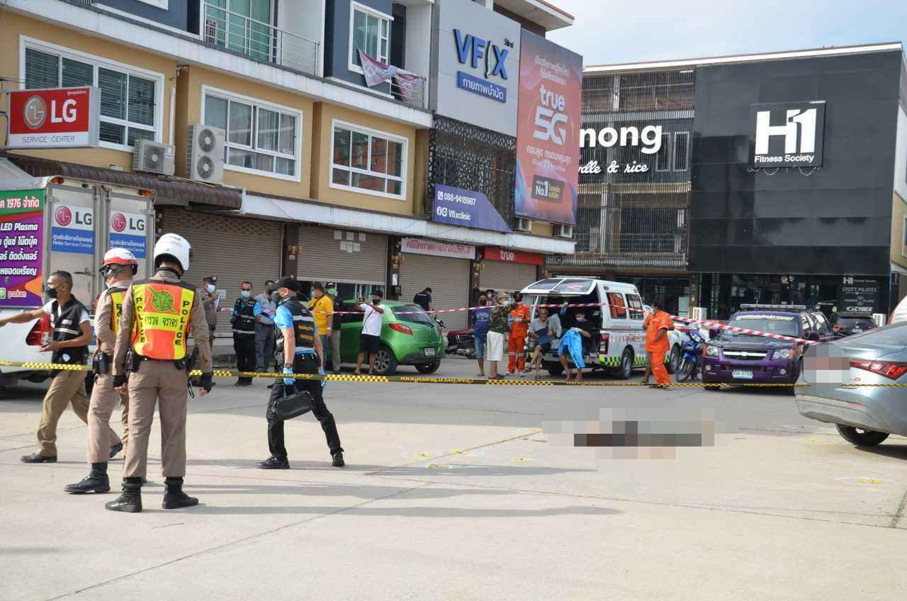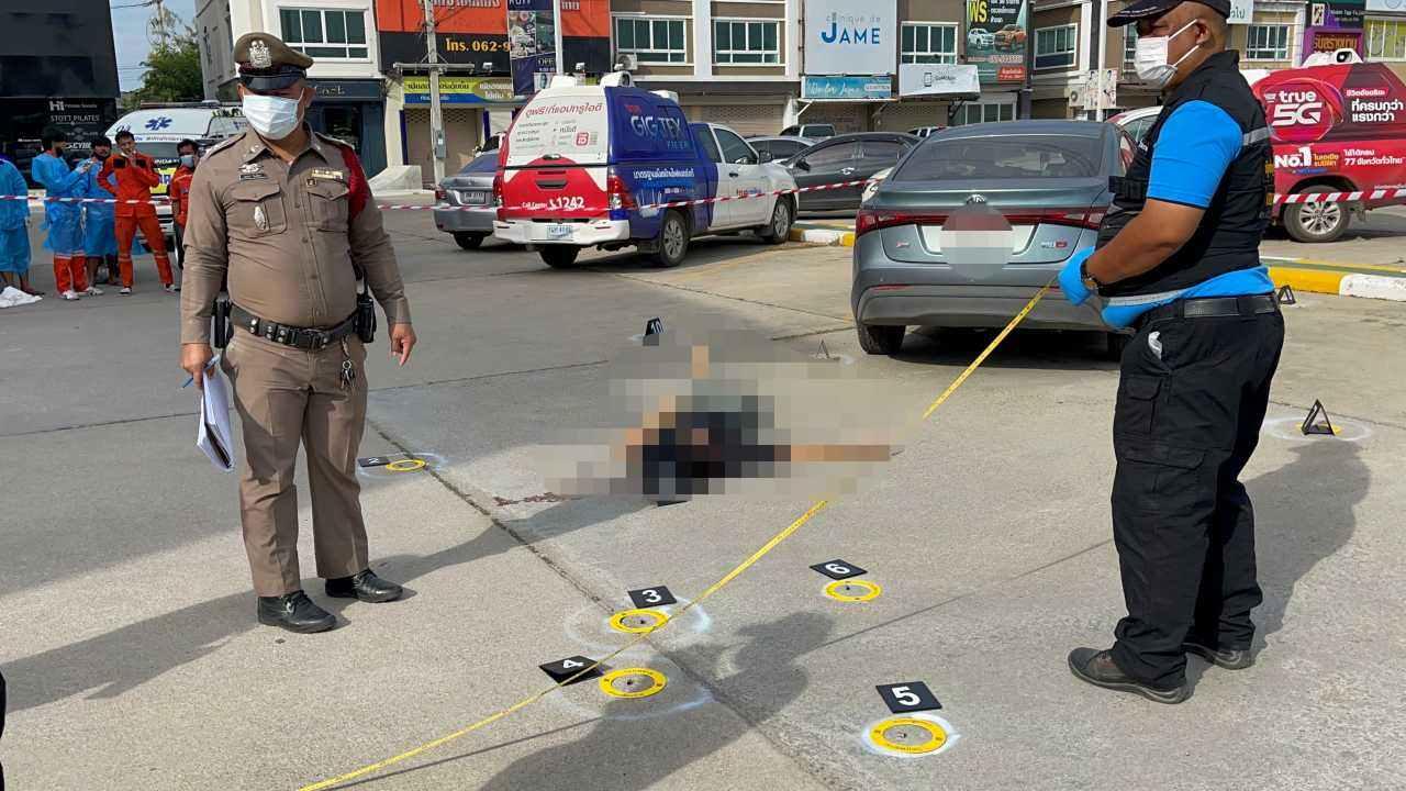 มือปืนโหดขี่ จยย.ขวางกระบะกลางสี่แยกไฟแดง มาทะเลาะสาวใหญ่คนขับ ก่อนไล่ยิงหนุ่มวัย 27 ปีที่พยายามวิ่งหนี สุดท้ายโดนรัวร่างพรุน 11 นัดดับคาลานจอดรถ ตร.เมืองกาญจนบุรี เร่งสอบหาปมเหตุการสังหาร