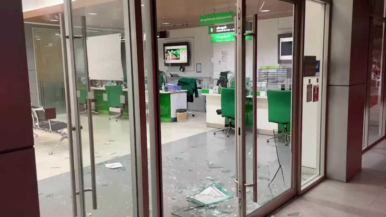 จากการสอบสวนเบื้องต้น นายกฤษฎา มาตีกำจร ผ้ได้รับบาดเจ็บที่อยู่ในอาการเมาสุรา ให้การรับสารภาพว่า ได้ก่อเหตุใช้ก้อนหินขนาดใหญ่น้ำหนักประมาณ 1 กิโลกรัม ทุบที่ประตูทางเข้าธนาคาร จริงเนื่องจากต้องการเงินไปซื้อสุราดื่ม แต่เข้าไปแล้วในธนาคารมืดและไม่พบเงินสดแต่อย่างใด จึงเดินออกมาด้านนอกที่ตู้เอทีเอ็มเพื่อเอาเงินแต่เอาไม่ได้ จึงเดินไปขอความช่วยเหลือที่ร้านสะดวกซื้อที่อยู่ใกล้เคียงเนื่องจากถูกกระจกบาดที่มือขวาเลือดไหลมาก จนเจ้าหน้าที่ตำรวจตามมาควบคุมตัวไว้ได้