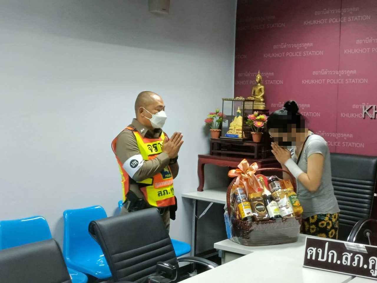 เมื่อเวลา 17.00 น.วันที่ 8 ม.ค.65 ที่ห้องประชุมชั้นสอง สภ.คูคต อ.ลำลูกกา จ.ปทุมธานี น.ส.อรวรรณ จุฑาจำเริญ อายุ 35 ปี ชาวบ้าน ต.บางแก้ว อ.บางพลี จ.สมุทรปราการ สาวคนขับ รถยนต์เมอร์เซเดส-เบนซ์ ป้ายแดง ที่ขับรถย้อนศรด้วยความเมา แแล้วยังทำร้ายตำรวจที่เข้าระงับเหตุ ได้นำกระเช้าน้ำผลไม้เดินทางมาที่สภ.คูคต ซึ่งมากับแม่โดยมอบให้กับดาบตำรวจ กิตติธัช พันสำโรง ผู้บังคับหมู่งานจราจร สภ.คูคต จ.ปทุมธานี ซึ่งมี พ.ต.ท.จิรพัฒน์ ศรีเดช รองผกก.ป.สภ.คูคต เป็นสักขีพยานในครั้งนี้