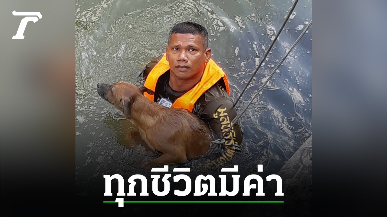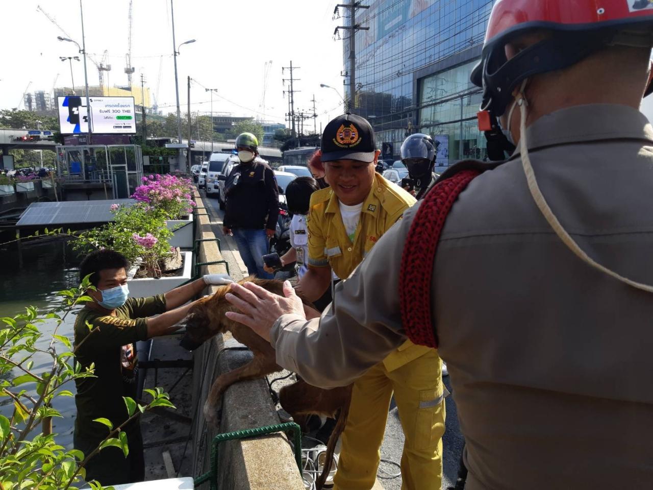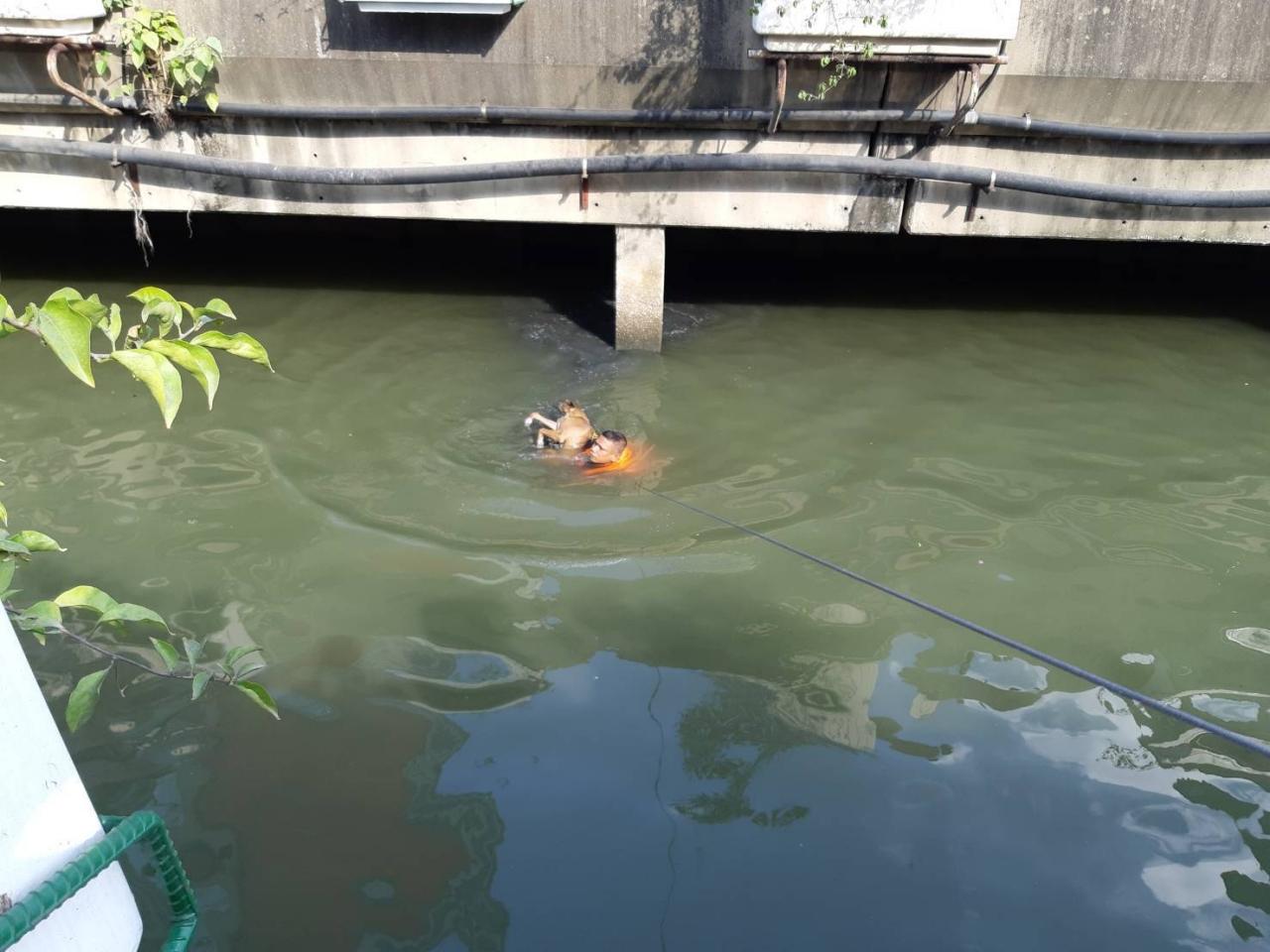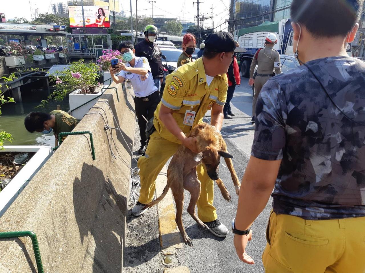 อาสาสมัครมูลนิธิร่วมกตัญญู ตัดสินใจสวมเสื้อชูชีพ กระโดดลงคลองสาทร ช่วย "อีแดง" สุนัขจรจัดเพศเมีย ไว้ได้ ท่ามกลางความโล่งใจจากประชาชนที่พบเห็นเหตุการณ์