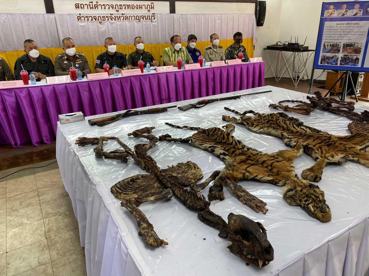 รองรอย ผบช.ภ.7 นำทีม ศปทส.ตร. แถลงรวบ 5 แก๊งพรานป่ามือยิงเสือโคร่งกลางป่าอุทยานฯ ทองผาภูมิจัดเต็ม แจ้ง 9 ข้อหาหนัก โดยรับสารภาพ 4 ให้การภาคเสธ 1 ราย