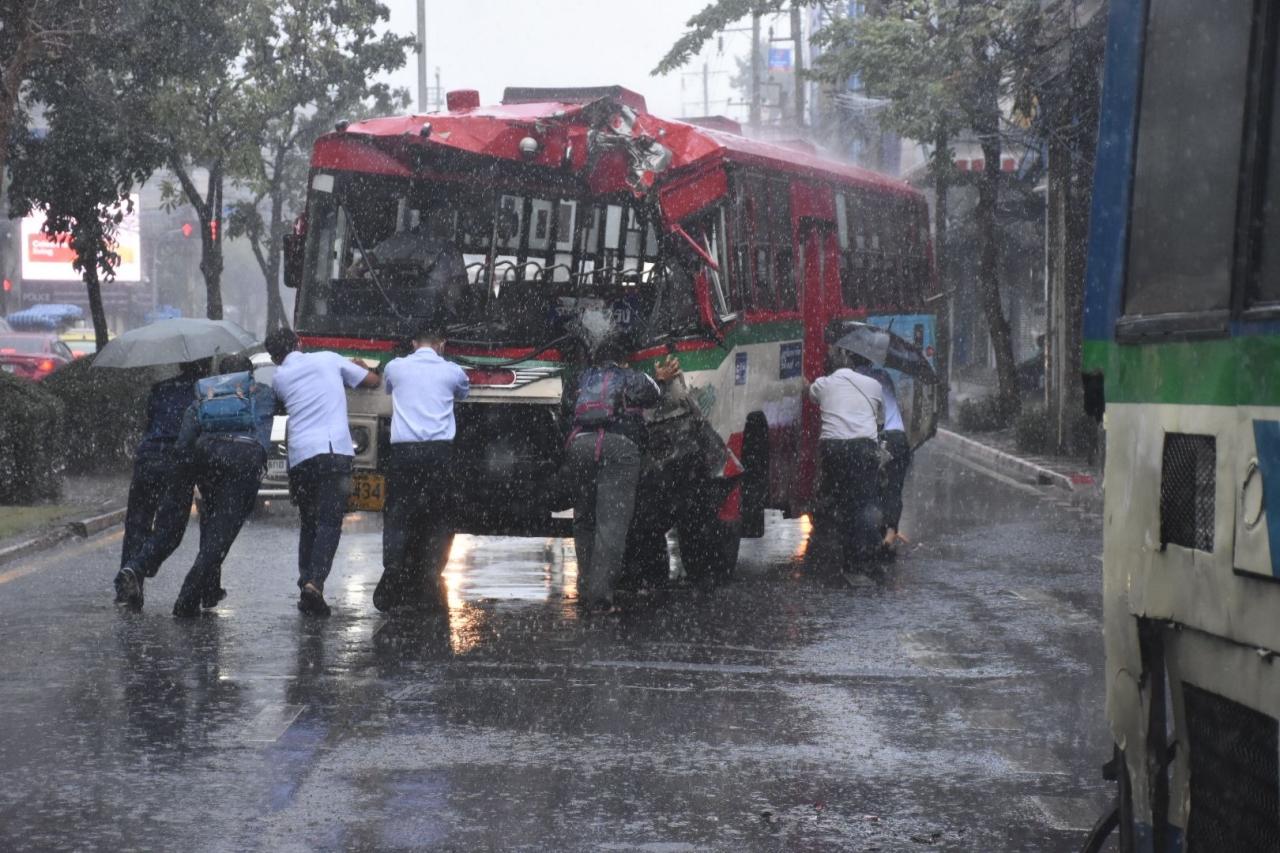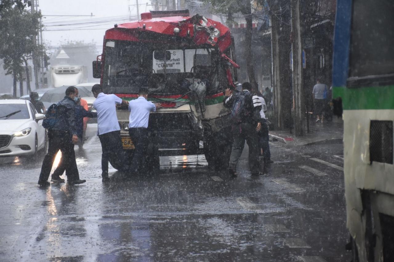 ขณะที่นายประพัทธ์ บุญมา อายุ 32 ปี พนักงานขับรถสาย 22 บอกว่า ขณะส่งผู้โดยสารลงที่ป้ายรถประจำทาง เกิดเสียงดังขึ้นที่บริเวณด้านหลัง ทราบว่ารถถูกชนโดยรถของตนมีผู้โดยสารเพียงคนเดียวที่ได้รับบาดเจ็บ เนื่องจากเป็นวันหยุดทำให้มีผู้โดยสารน้อย และช่วงขณะเกิดเหตุมีฝนตกลงมาอย่างหนักทำให้สภาพถนนลื่น