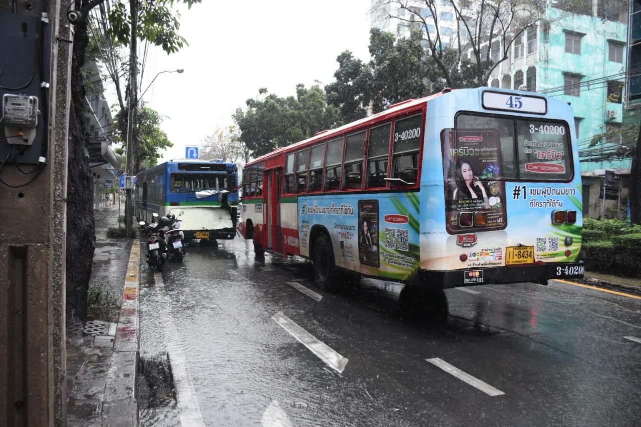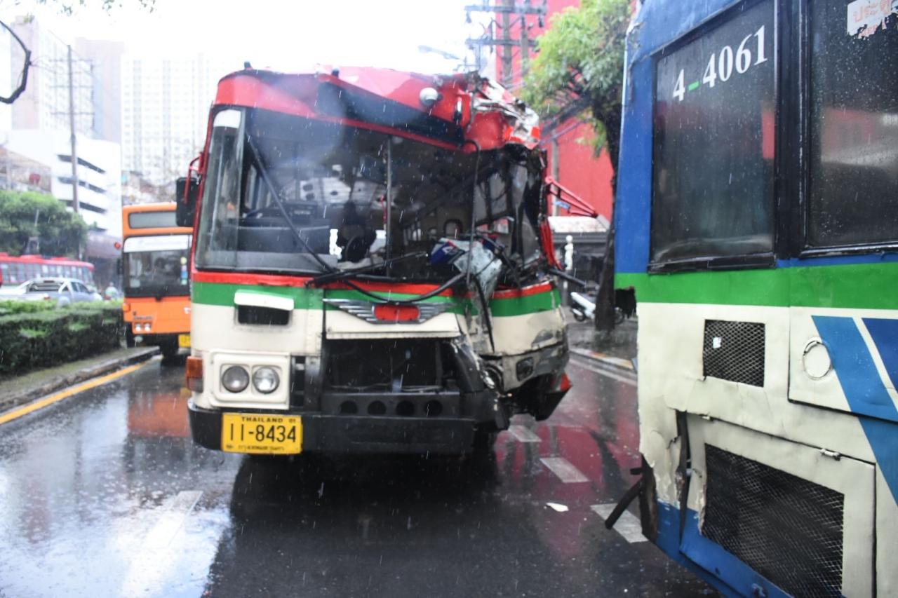 เกิดอุบัติเหตุรถเมล์ชนกันที่บริเวณแยกกล้วยน้ำไท ทิศทางมุ่งหน้าถนนสุขุมวิท ถนนพระราม 4 แขวงพระโขนง เขตคลองเตย กทม. ส่งผลให้มีผู้โดยสารได้รับบาดเจ็บหลายราย