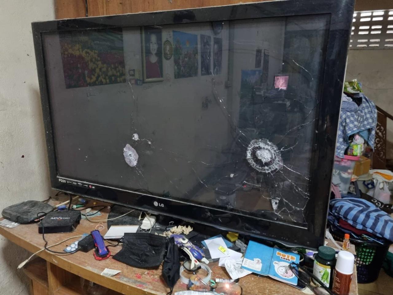 ส่วนบริเวณนอกตัวบ้านด้านหน้าห่างไปทางซีกขวา 5 เมตร พบหลักฐาน เป็นลูกกระสุนปืน ขนาด 5.56 ซึ่งเป็นกระสุนที่ใช้กับปืนเล็กยาวจู่โจมแบบเอ็ม 16 และ ปืนเล็กยาวแบบ HK 33 สภาพชำรุดติดขัด ถูกกระชากลำเลื่อนคัดทิ้งจากตัวอาวุธตกอยู่บนพื้น 1 นัด และยังพบปลอกกระสุนปืนขนาดเดียวกันที่ถูกยิงไปแล้ว อีกทั้งสิ้น 4 ปลอก กระจัดกระจายเกลื่อนพื้นโดยที่จานท้ายของกระสุนทุกนัด มีอักษรย่อ RTA และตัวเลข 17 โดยเป็นกระสุนปืนที่มีใช้ในกองทัพผลิตเมื่อปี 2017 เป็นสัญลักษณ์เจ้าหน้าที่จึงเก็บรวบรวมรายละเอียดที่พบไว้เป็นหลักฐาน