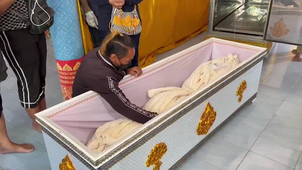 เวลา 14.00 น. วันที่ 5 ก.พ. 65 นายประสาน หมทอง พ่อของน้องเต็น หรือนางสาวสุมิตา พลเสน อายุ 18 ปี ผู้เสียชีวิตถูกฆ่าและนำศพยัดกล่อง ในพื้นที่ อ.เมือง จ.สุพรรณบุรี เดินทางไปรับศพน้องเต็น จากนิติเวชโรงพยาบาลตำรวจ มาถึงที่วัดชุมนุมพระ หมู่ 8 ต.หนองฝ้าย อ.เลาขวัญ จ.กาญจนบุรี ที่มีการจัดเตรียมทำพิธีบำเพ็ญกุศล บรรยากาศเป็นไปด้วยความโศกเศร้า โดยนำศพใส่โลง ยกขึ้นแท่นเพื่อรอการประดับหน้าโลง