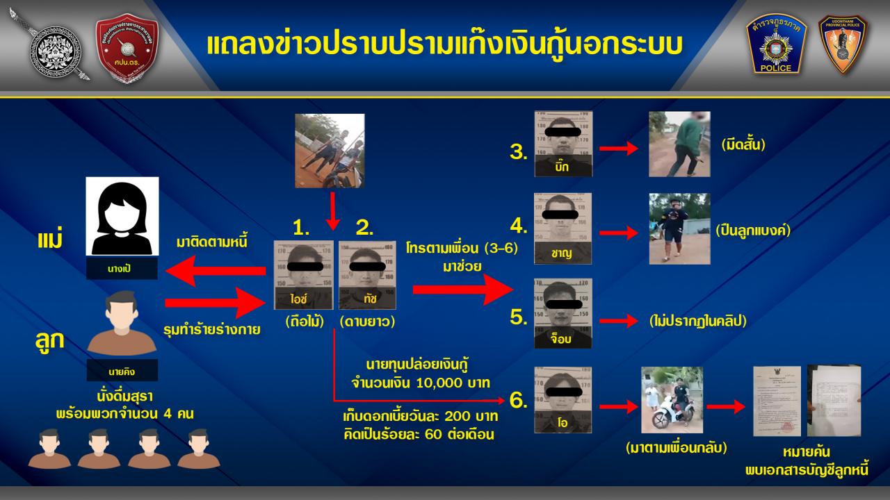 จากรณีแก๊งเงินกู้ควงปืนบุกยิงขู่บ้านลูกหนี้ หลังจากทะเลาะวิวาทกับลูกชายลูกหนี้วัย 16 ปี โดยไม่สนเสียงขอร้องและอ้อนวอนของเพื่อนบ้านที่อยู่ในเหตุการณ์ เหตุเกิดช่วงเย็นวันที่ 11 กุมภาพันธ์ ที่ผ่านมา ในพื้นที่ บ.หนองบุ ต.สามพร้าว อ.เมืองอุดรธานี ต่อมาตำรวจสามารถติดตามจับกุมแก๊งเงินกู้ทั้งหมด 6 คน พร้อมของกลางอาวุธที่ใช้ก่อเหตุ ช่วงหัวค่ำวันที่ 12 กุมภาพันธ์ ที่ผ่านมา ตามที่เสนอข่าวไปแล้วนั้น