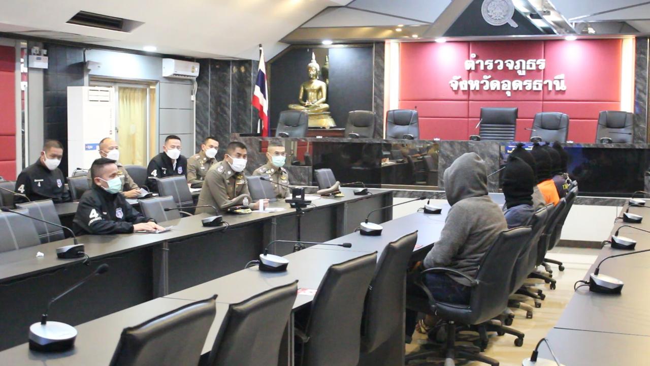 เมื่อเวลา 11.00 น. วันที่ 13 ก.พ.65 ที่กองบังคับการตำรวจภูธรจังหวัดอุดรธานี พล.ต.ท.สุรเชษฐ์ หักพาล ผช.ผบ.ตร. พล.ต.ต.ณัฐนนท์ ประชุม ผบก.สส.ภ.4 พล.ต.ต.พิษณุ อุณหเสรี ผบก.ภ.จ.อุดรธานี พร้อมด้วยตำรวจสืบสวน ภ.4 ตำรวจสืบสวน ภ.จ.อุดรธานี และตำรวจสืบสวน สภ.เมืองอุดรธานี ร่วมกันสอบปากคำและแถลงข่าวผลการจับกุมแก๊งเงินกู้ ประกอบด้วย นายชาญชัย หรือชาญ เววิชัยโก อายุ 23 ปี นายธนาวุฒิ หรือจ๊อบ สุขมานพ อายุ 23 ปี นายบรรพต หรือบิ๊ก แสนโคตร อายุ 22 ปี นายธนพล หรือทัช บุราโส อายุ 23 ปี ชาว อ.เมือง จ.อุดรธานี นายวสันต์ หรือโอ เมฆประทีป อายุ 24 ปี และนายวรพล หรือไอซ์ คล้ายนุช อายุ 19 ปี ชาว อ.เมือง จ.พิจิตร