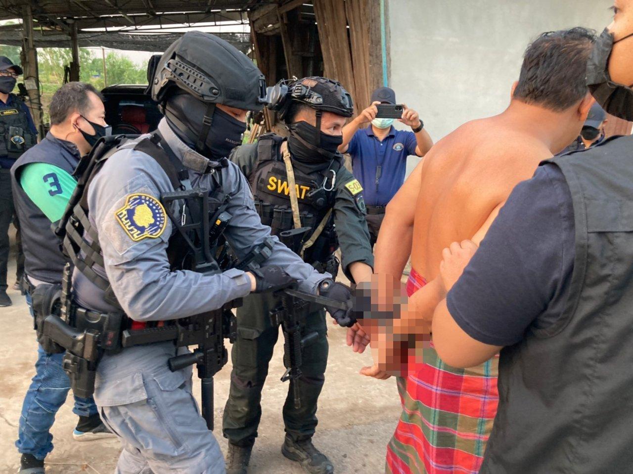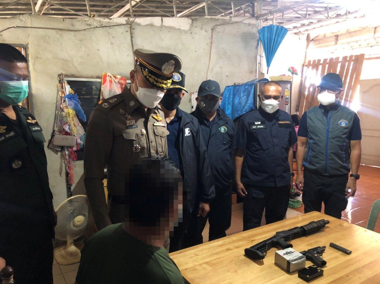 และ จุดที่ 3 บ้านในพื้นที่ ม.4 ต.ศรีจุฬา อ.เมืองนครนายก จ.นครนายก ตามหมายค้นศาลจังหวัดนครนายกที่ ค.9/2565 ลงวันที่ 21 ก.พ. 65 พบ นายธวัชชัย ศรีชาญ หรือ "วัช" ผู้ต้องหาตามหมายจับอยู่ในบ้าน ได้จับกุมตัวและแจ้งข้อกล่าวหาตามหมายจับให้ทราบ ก่อนนำตรวจค้นภายในบ้าน พบอาวุธปืนยาว ชนิดเดี่ยวลูกซอง ยี่ห้อ commando ขนาด 12 จำนวน 1 กระบอก อาวุธปืนสั้น ชนิดกึ่งอัตโนมัติ ยี่ห้อ Colt ขนาด 9 มม. จำนวน 1 กระบอก กระสุนปืนลูกซองขนาด 12 จำนวน 4 นัด กระสุนปืนพกขนาด .38 จำนวน 20 นัด GPS ใช้สะกดรอยติดตามรถยนต์ 1 เครื่อง แผ่นป้ายทะเบียนปลอม 1 แผ่น อ้างว่าเก็บได้