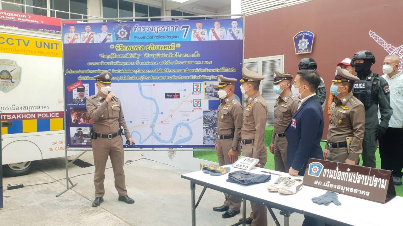 โดยทางด้าน พ.ต.อ.ธนากร วงศ์สิริลักษณ์ ผกก.สภ.เมืองสมุทรสาคร กล่าวว่า พฤติการณ์ก่อนจับกุมเมื่อวันที่ 1 เม.ย. 65 เวลา 03.17 น. ได้มีคนร้ายเป็นชายจำนวน 1 คน สวมหมวกกันน็อกสีดำแบบเต็มใบ ยี่ห้อ INDEX สวมแมสก์สีขาว สวมเสื้อคลุมแขนยาวสีดำ สวมถุงมือสีน้ำเงิน สวมกางเกงยีนส์ขายาวสีน้ำเงิน สวมรองเท้าผ้าใบสีขาวแถบคาดน้ำเงินหรือสีดำ ยี่ห้อ Puma ก่อเหตุใช้อาวุธมีดชิงทรัพย์ร้านสะดวกซื้อ 7-11 สาขาปากทางสวนส้ม ต.บางกระเจ้า อ.เมือง จ.สมุทรสาคร ได้ทรัพย์สินเป็นเงินสดประมาณ 10,000 บาท