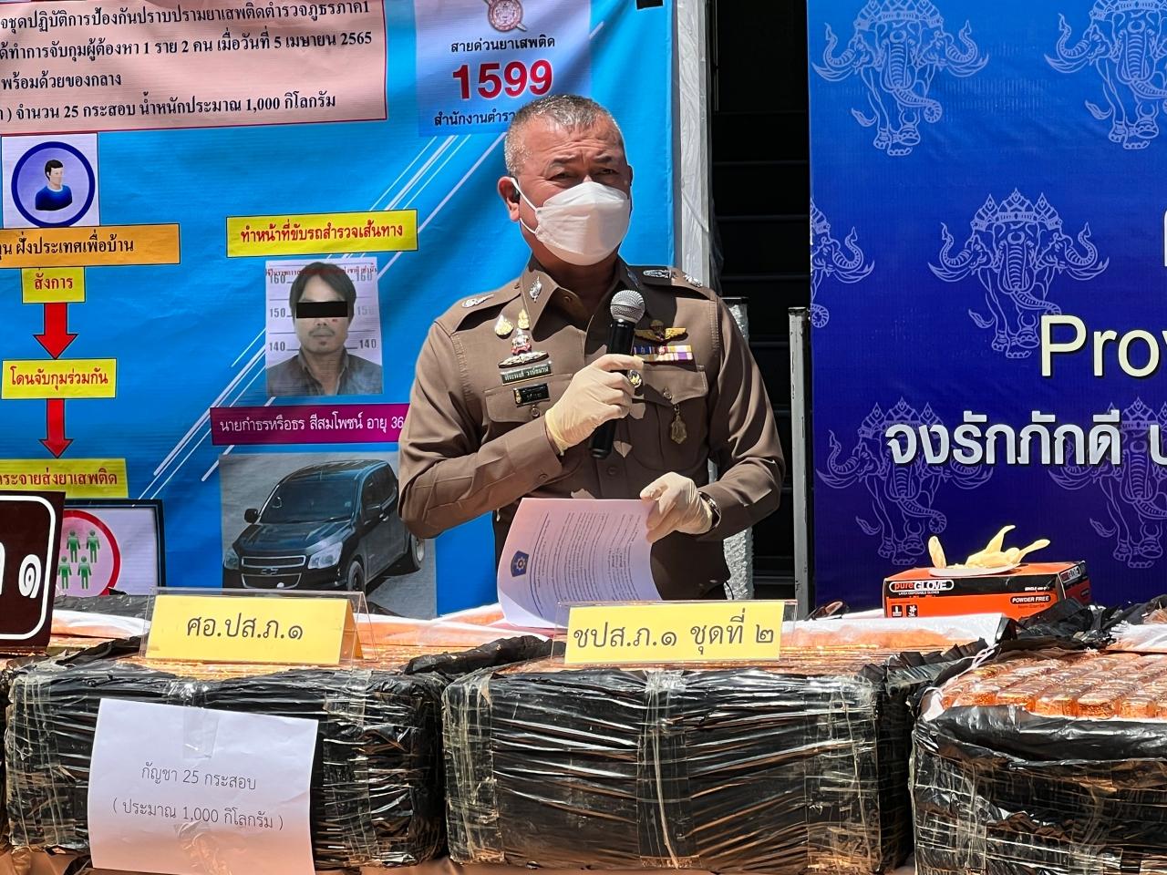 เมื่อเวลา 11.00 น. วันที่ 6 เมษายน 2565 พล.ต.ต.พีระพงศ์ วงษ์สมาน รอง ผบช.น. ปฏิบัติราชการ ภ.1 แถลงข่าว พล.ต.ต.ชยานนท์ มีสติ ผบก.ภ.จ.สระบุรี กำลังตำรวจสืบสวนภาค 1 จับกุมตัว นายเสกสรร หรือดำ ไชยสาป อายุ 35 ปี ชาว จ.กาฬสินธุ์ นายเกรียงไกร หรือกล โคตะวินนท์ อายุ 30 ปี ชาว จ.กาฬสินธุ์ นายกำธร หรือธร สีสมโพชน์ อายุ 36 ปี ชาว จ.นครพนม พร้อมด้วยของกลางกัญชาอัดแท่งบรรจุอยู่ในกระสอบถุงปุ๋ย ห่อด้วยถุงพลาสติกสีดำ จำนวน 25 กระสอบ น้ำหนัก 1,000 กิโลกรัม รถยนต์ตู้โตโยต้าสีบรอนซ์ ทะเบียน ฮจ 1776 กรุงเทพมหานคร รถยนต์กระบะเชฟโรเลต สีดำ ทะเบียน กท 4939 ชัยภูมิ โทรศัพท์มือถือ 3 เครื่อง โดยกล่าวหาว่า ร่วมกันครอบครองยาเสพติดให้โทษประเภท 5 (กัญชา) เพื่อการค้าโดยไม่ได้รับอนุญาต