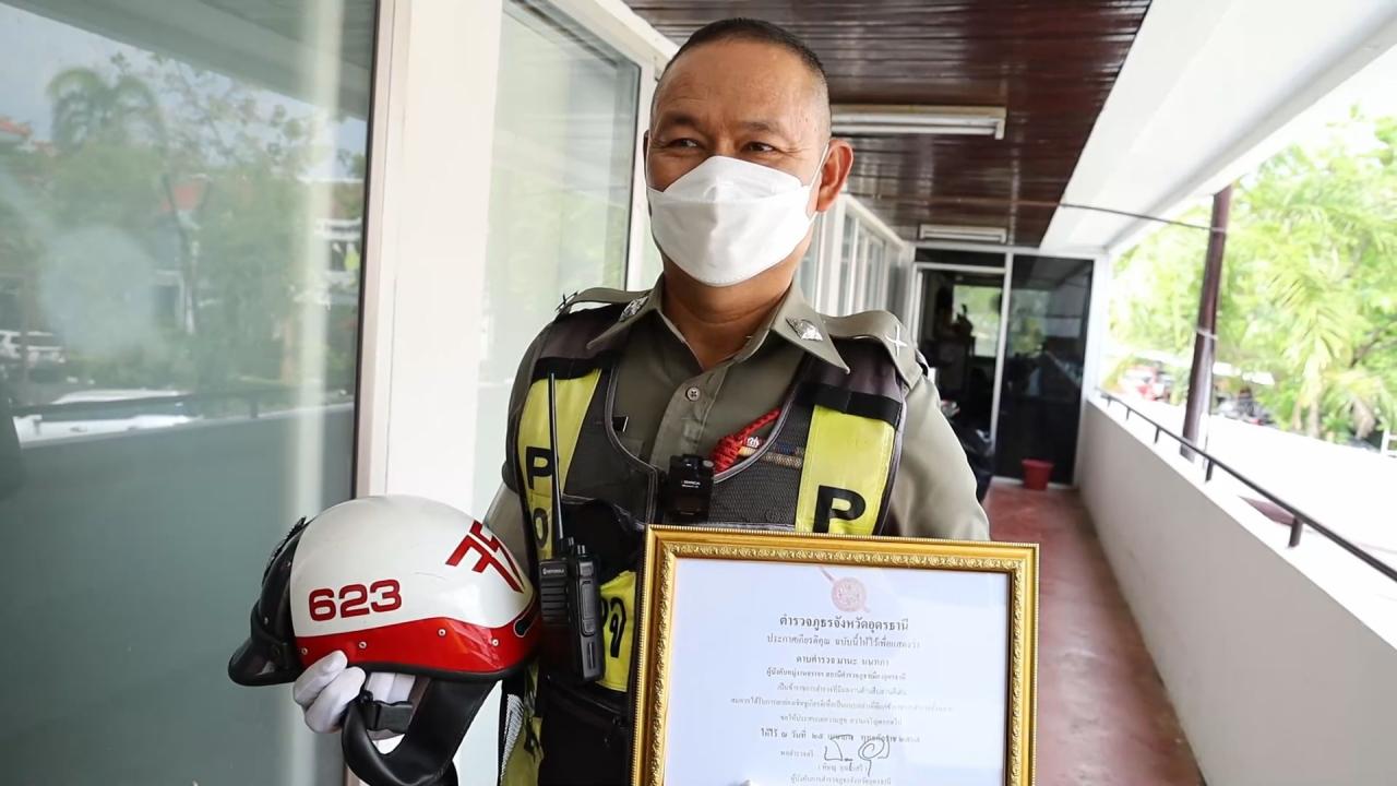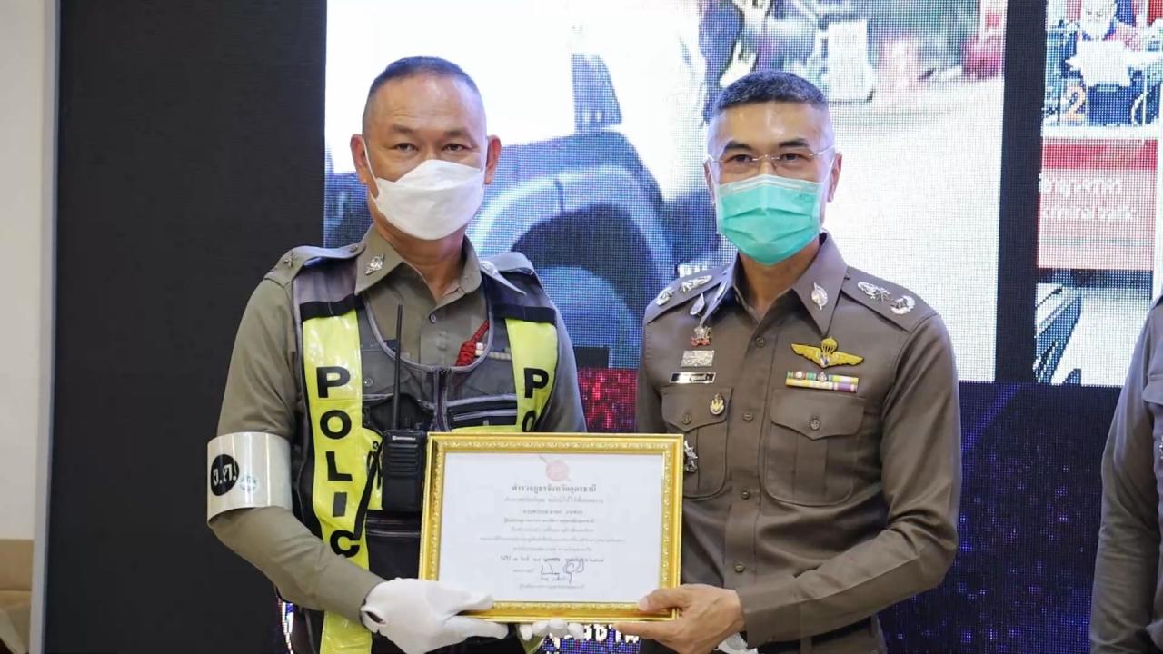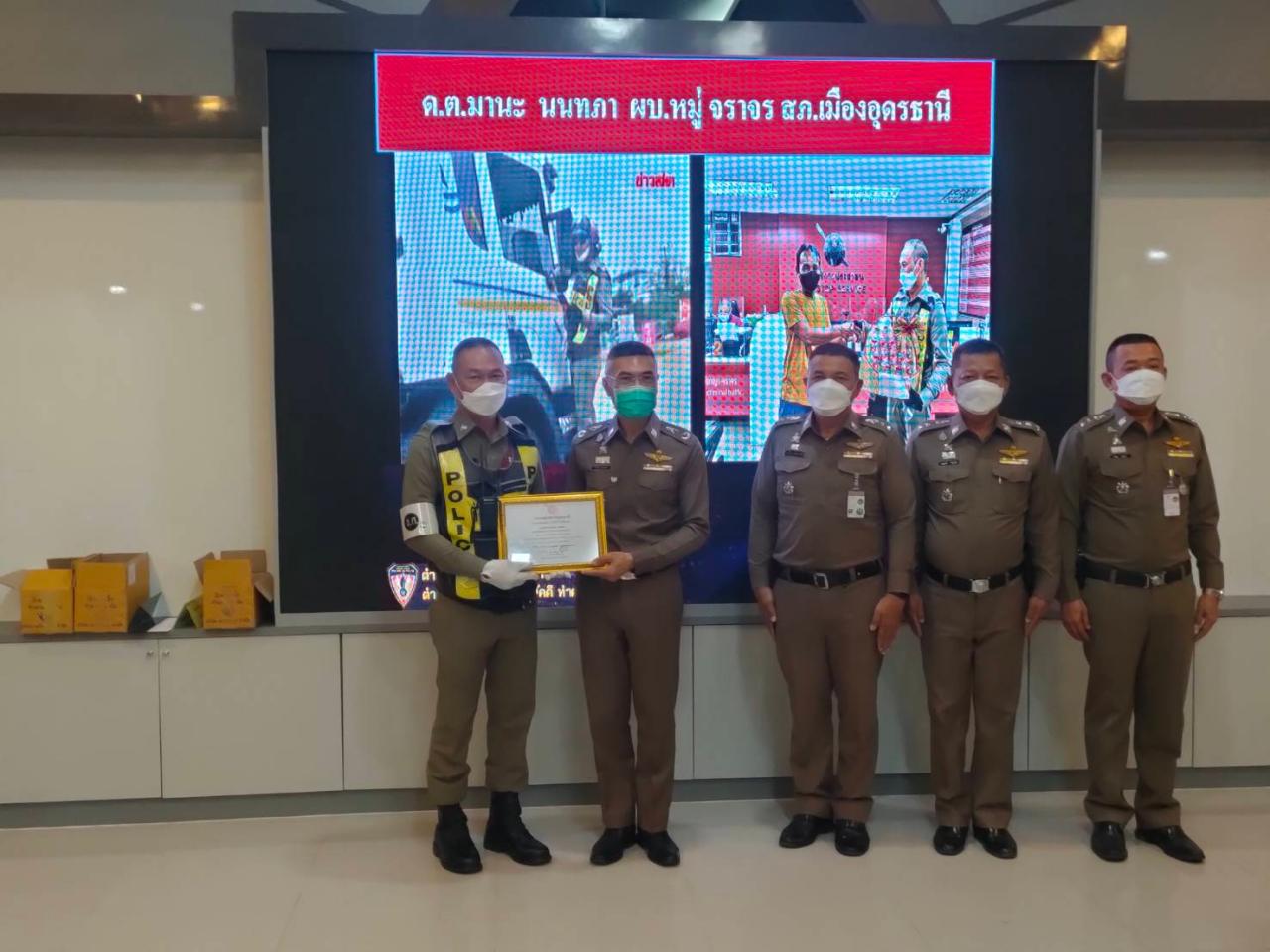 พล.ต.ต.พิษณุ อุณหเสรี ผบก.ภ.จว.อุดรธานี มอบใบประกาศเกียรติบัตรและเงินรางวัลให้ดาบตำรวจจราจรใจเด็ด โดดเกาะรถบรรทุกน้ำมันฝ่าไฟแดง เผยหากเกิดเหตุครั้งหน้าขอคิดดูก่อน หลังญาติโทรมาบอก "อย่าทำอย่างนี้อีกเด้อ"