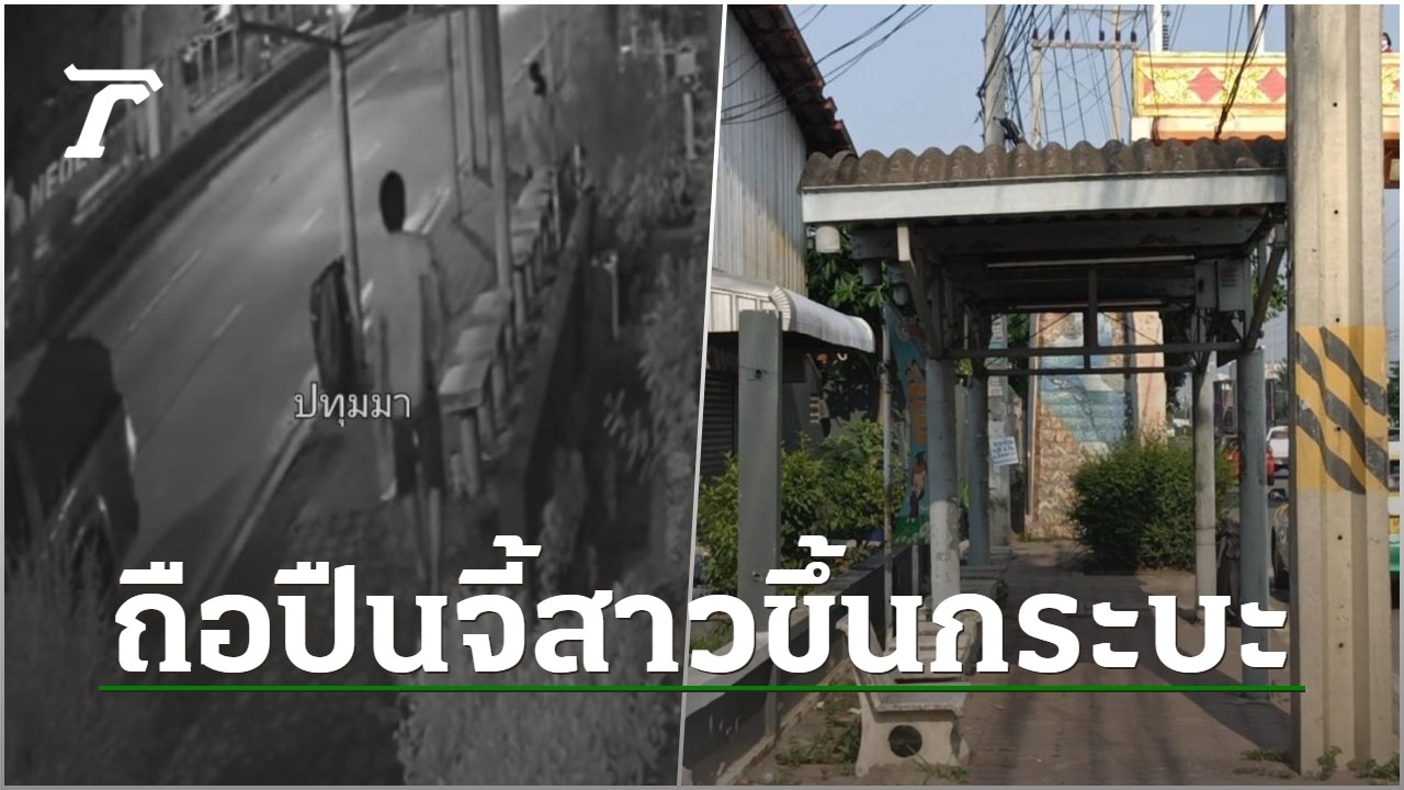 เผยภาพวงจรปิดจับภาพหนุ่มนิรนามขับกระบะมาจอดที่ป้ายรถเมล์ เอาปืนลงมาจี้หญิงสาวที่นั่งรอบังคับให้ขึ้นรถ โชคดีผู้เสียหายมีสติสะบัดหนีขึ้นรถเมล์เอาตัวรอดได้ แจ้งความ สภ.ลำลูกกา ล่าตัวภัยสังคม