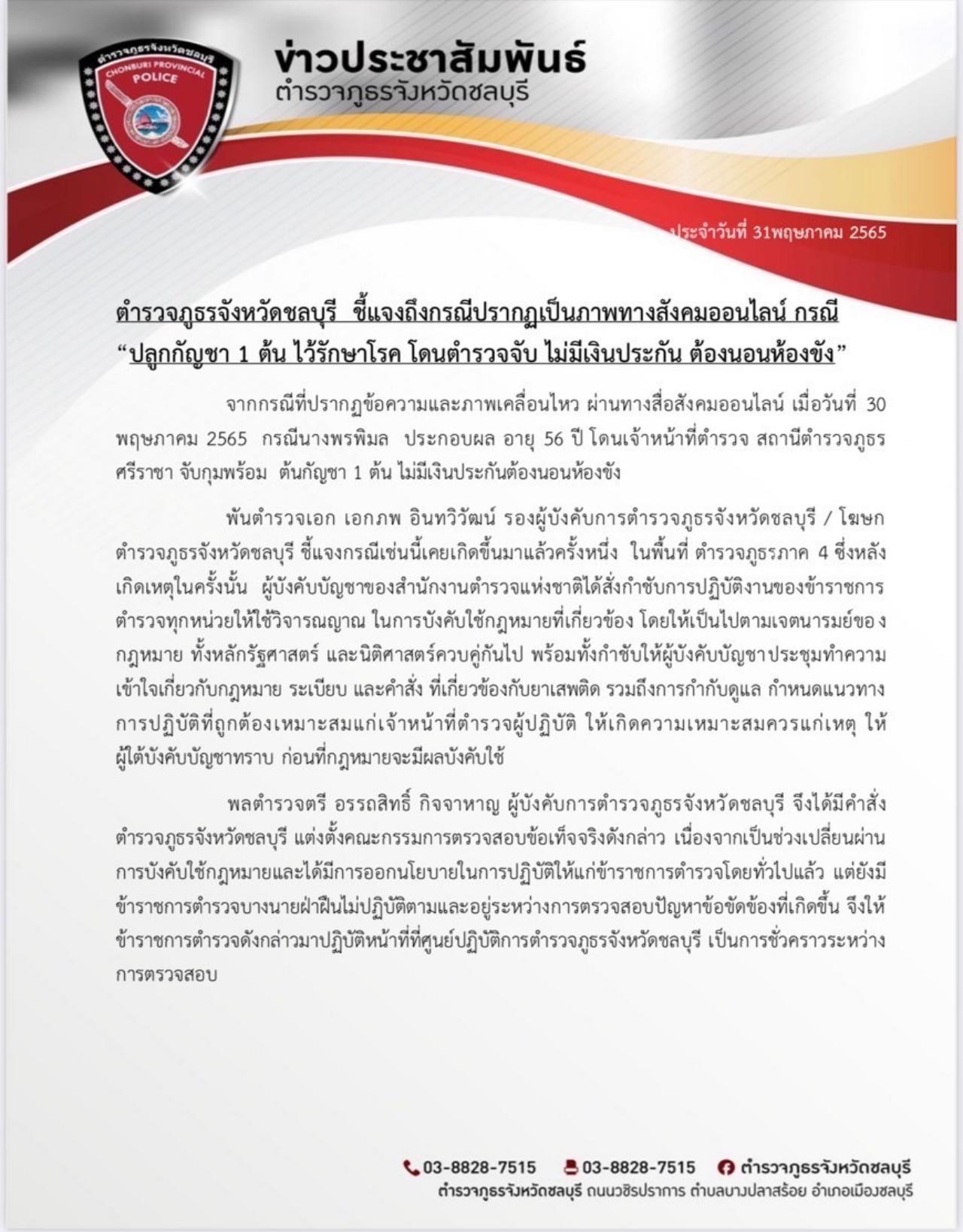 เมื่อวันที่ 31 พฤษภาคม 2565 พล.ต.ต.ชัยต์พจน สุวรรณรักษ์ รอง ผบช.ภ.2/โฆษก ภ.2 เปิดเผยว่า ตำรวจภูธรภาค 2 ชี้แจง กรณีตำรวจ สภ.ศรีราชา จับหญิงอายุ 56 ปี ดำเนินคดีข้อหา "ปลูกกัญชาไว้ในบ้าน" นั้น และปรากฏในสื่อสังคมออนไลน์ กรณี ตำรวจสายสืบ สภ.ศรีราชา ได้ควบคุมตัวหญิงอายุ 65 ปี ไปดำเนินคดีในข้อหาปลูกกัญชา จำนวน 1 ต้น ไว้ในบ้านนั้น