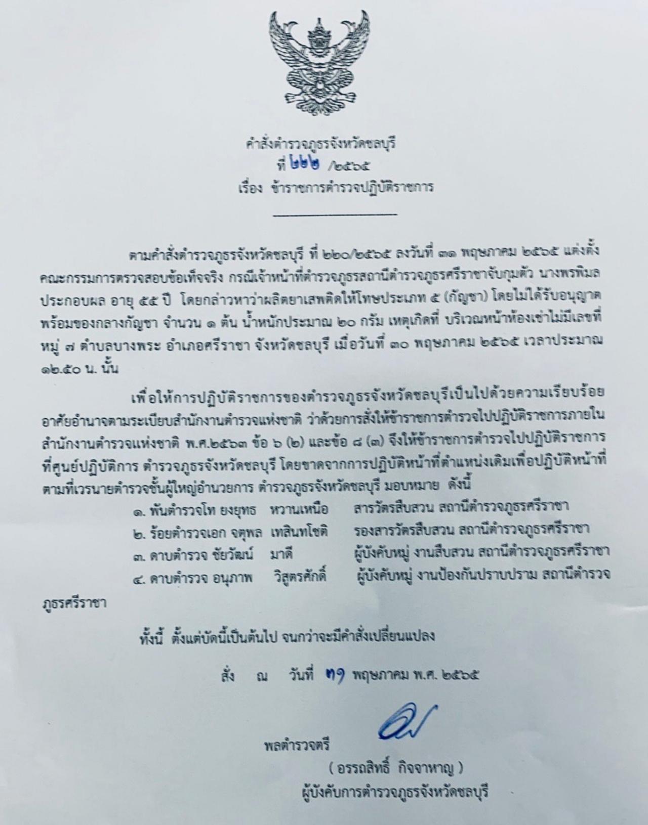 โฆษก ภ.2 เปิดเผยอีกว่า ล่าสุด ตำรวจภูธรจังหวัดชลบุรี ได้มีคำสั่งให้ข้าราชการตำรวจทั้ง 4 นาย ไปปฏิบัติหน้าที่ยัง ศปก.ภ.จว.ชลบุรี โดยขาดจากต้นสังกัด ทั้งนี้ตั้งแต่บัดนี้เป็นต้นไปจนกว่าจะมีคำสั่งเปลี่ยนแปลง.