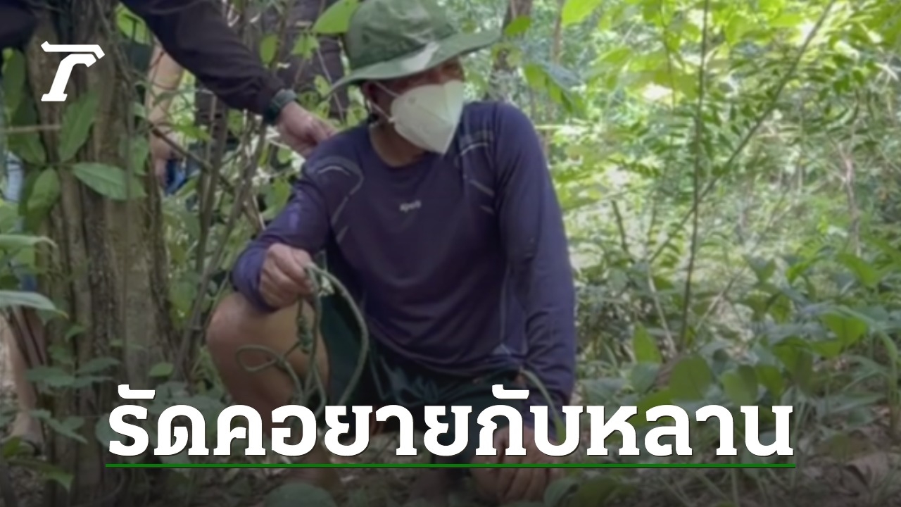 เมื่อตรวจห่างออกไปอีก 200 เมตรเป็นป่าดอนปู่ตาของหมู่บ้าน เดินเข้าไปในป่าลึกประมาณ 50 เมตรพบเชือก 3 เส้นตกอยู่ใต้ต้นไม้ นายเตี้ย สารภาพว่า เชือกเส้นสีเขียวเป็นเส้นที่เอาไว้ผูกประตูทางขึ้นตรงช่องบันไดบ้านตอนไปก่อเหตุ ส่วนอีก 2 เส้น ตนเอามาจากบ้าน ใช้รัดคอยายและหลานสาวโดยยังมีคราบเลือดติดข้างต้นไม้ที่นายเตี้ยเอามือไปจับ นายเตี้ยยังให้การด้วยว่า “ทิ้งไม้ที่ใช้ตีศีรษะยายกับหลานไว้ในป่าหลังจากทิ้งเชือก แต่ยังหาไม่เจอ ส่วนเชือกเส้นใหญ่ใช้รัดคอยาย เชือกเส้นเล็กเอามารวมกันรัดคอหลาน หลังจากก่อเหตุได้เดินมาทางหลังบ้านพบสระน้ำอยู่ท้ายหมู่บ้าน จึงโยนโทรศัพท์ทั้ง 2 เครื่อง ลงไปในสระน้ำ และเดินไปตามทางถนนคอนกรีตถึงป่าดอนปู่ตาจึงเข้าไปทิ้งเชือกทั้ง 3 เส้นแล้วเดินออกจากป่าเข้าหมู่บ้านเพื่อกลับไปบ้าน เปลี่ยนเสื้อผ้าอาบน้ำเข้านอนช่วงประมาณ เกือบตี 4”
