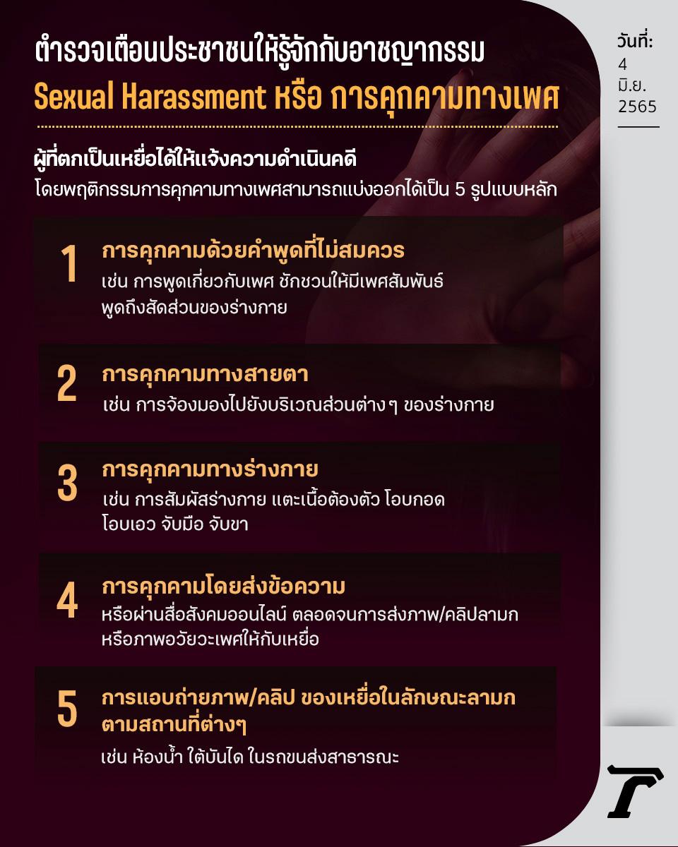 สำนักงานตำรวจแห่งชาติ จึงขอโอกาสนี้ในการนำพี่น้องประชาชนไปรู้จักกับอาชญากรรมรูปแบบหนึ่ง ที่ไม่ว่าใครก็สามารถตกเป็นเหยื่อได้ ไม่ว่าจะเป็นหญิง ชาย เด็ก ผู้ใหญ่ หรือ เพศทางเลือก ซึ่งอาชญากรรมในรูปแบบดังกล่าวก็คือ Sexual Harassment หรือภาษาไทยคือ การคุกคามทางเพศ ซึ่งหมายถึง การกระทำหรือการแสดงออกในทางเพศ ทั้งโดยตรงหรือโดยอ้อม ผ่านการใช้สายตา ท่าทาง เสียง คำพูด ร่างกาย หรือสื่อสารผ่านช่องทางต่างๆ ทำให้ผู้ที่ตกเป็นเป้าของการกระทำนั้น รู้สึกเดือดร้อนรำคาญ อึดอัด ไม่พอใจ เครียด หวาดระแวง หวาดกลัว และรู้สึกไม่ปลอดภัย