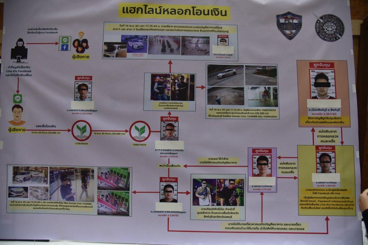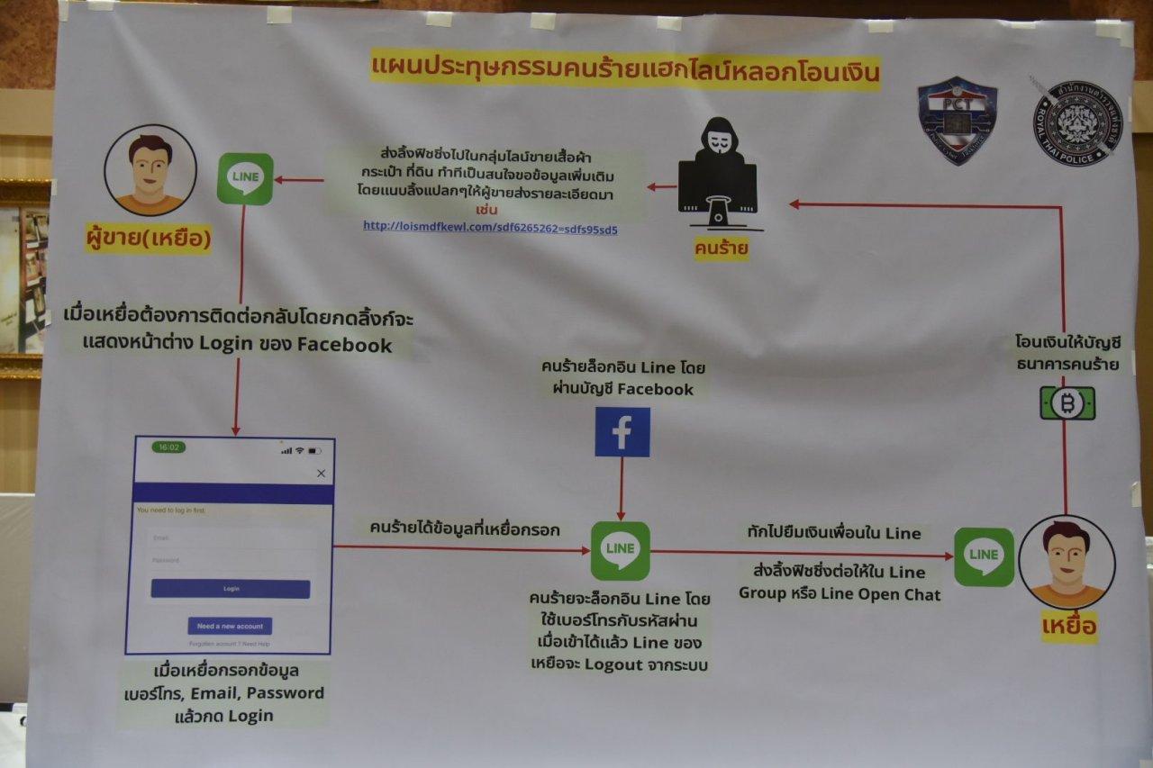 จากกรณีที่มีคนร้ายแฮกไลน์เหยื่อแล้วทักไปยืมเงินเพื่อนในไลน์ ซึ่งระบาดหนัก เปิดเผยวันที่ 7 มิ.ย. 65 เวลา 10.30 น. พล.ต.อ.ดำรงศักดิ์ กิตติประภัสร์ รอง ผบ.ตร. ผู้อำนวยการศูนย์ปราบปรามอาชญากรรมทางเทคโนโลยีสารสนเทศ (ศปอส.ตร.) หรือ PCT, พล.ต.อ.ปรีชา เจริญสหายานนท์ ที่ปรึกษาพิเศษ ตร. พล.ต.ท.ปิยะ ต๊ะวิชัย ผบช.ภ.5, พล.ต.ท.จิรภพ ภูริเดช ผบช.ก., พล.ต.ต.ธีรเดช ธรรมสุธีร์ ผบก.สส.ภ.2 หน.ชป. 5 PCT, พล.ต.ต.ศารุติ แขวงโสภา ผบก.ปอท., พล.ต.ต.นิเวศน์ อาภาวศิน ผบก.ตอท., พล.ต.ต.ธวัชชัย พงษ์วิวัฒน์ชัย ผบก.จว.เชียงใหม่ ร่วมแถลงผลการจับกุมขบวนการแฮกไลน์ มีผู้เสียหายจำนวนมาก มูลค่าความเสียหายรวมกว่า 50 ล้านบาท