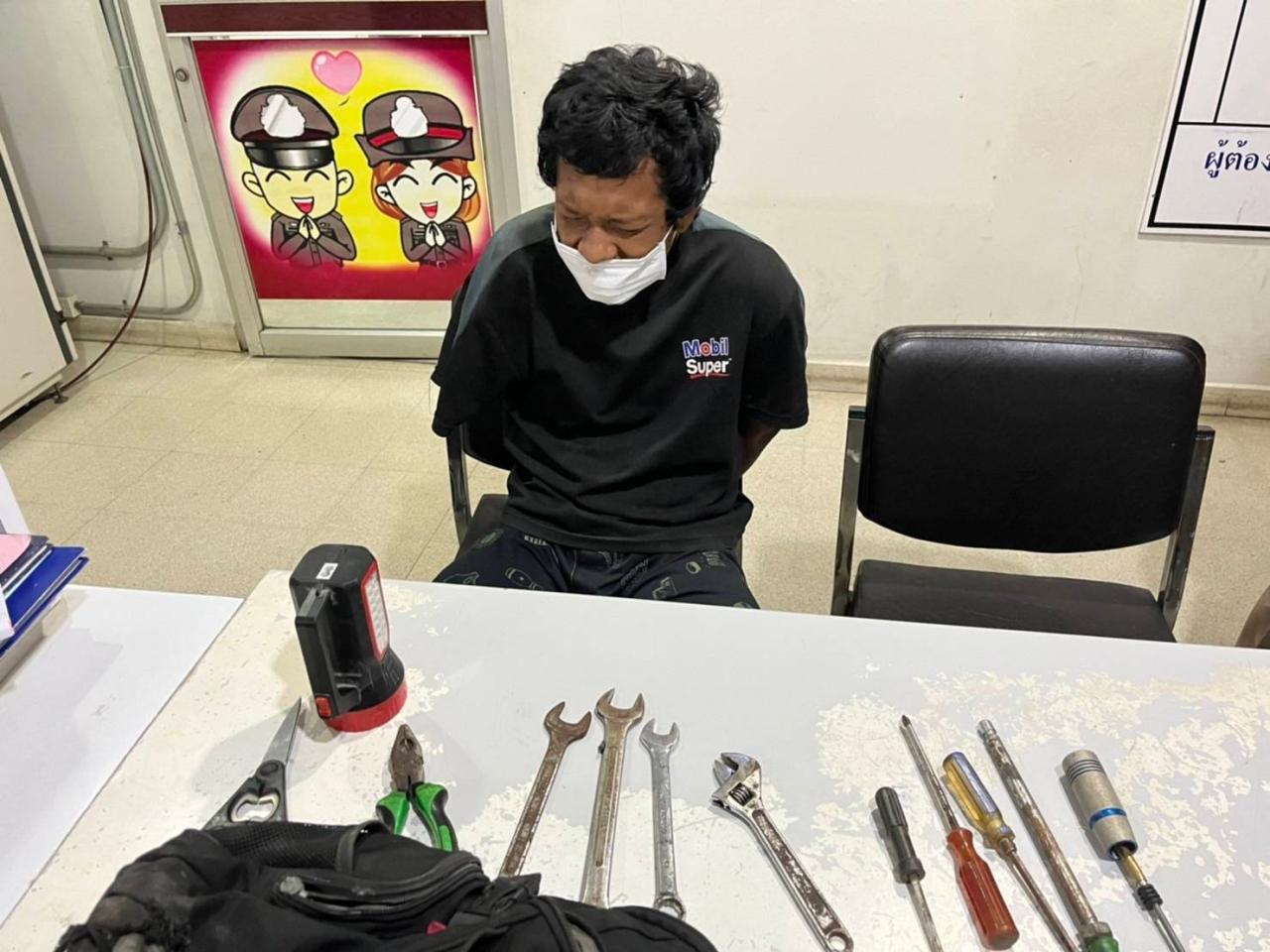 จากการตรวจค้นในตัวพบยาบ้าจำนวน 3 เม็ด บรรจุอยู่ในหลอดสีเขียว ในกระเป๋ากางเกงยีนส์ขาสั้นด้านขวา ส่วนในกระเป๋าสะพายพบอุปกรณ์เครื่องมือช่างประกอบด้วย 1.ไขควง 4 ด้าม 2.กุญแจเลื่อน 1 ด้าม