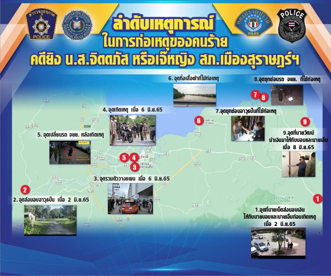 ต่อมาเมื่อวันที่ 20 มิ.ย.2565 เจ้าหน้าที่ตำรวจชุดสืบสวน ได้ทำการสืบสวนจนเชื่อว่ากลุ่มคนร้ายที่ก่อเหตุมีจำนวนหลายคน โดยมีการวางแผน แบ่งหน้าที่กันทำอย่างชัดเจน จึงได้ขออนุมัติศาลจังหวัดสุราษฎร์ธานี ออกหมายจับผู้ต้องหา 5 ราย ได้แก่ นายธัญญะ หรือ บอมบ์ อายุ 31 ปี ทำหน้าที่ เป็นผู้ใช้อาวุธปืนยิงผู้ตาย จับกุมแล้ว เมื่อ 21 มิ.ย.2565 นายณัฐพงศ์ หรือ เอ็ม อายุ 31 ปี ทำหน้าที่ เป็นผู้ขับขี่รถ จยย. คันก่อเหตุ /ดูเป้า จับกุมแล้ว เมื่อ 21 มิ.ย.2565 นายรณกร หรือ วัตน์ อายุ 49 ปี ทำหน้าที่ เป็นผู้รับงาน/ผู้จัดหามือปืน/วางแผนก่อเหตุจับกุมแล้ว เมื่อ 21 มิ.ย.2565 นายอรรถพร หรือ เบ็ต อายุ 68 ปี ทำหน้าที่ เป็นผู้รับงาน/ชี้เป้า/วางแผนก่อเหตุ จับกุมแล้ว เมื่อ 21 มิ.ย.2565 นายสมหมาย หรือหมาย อาย 63 ปี ทำหน้าที่ เป็นผู้ใช้ จ้างวาน จับกุมแล้ว เมื่อ 22 มิ.ย.2565