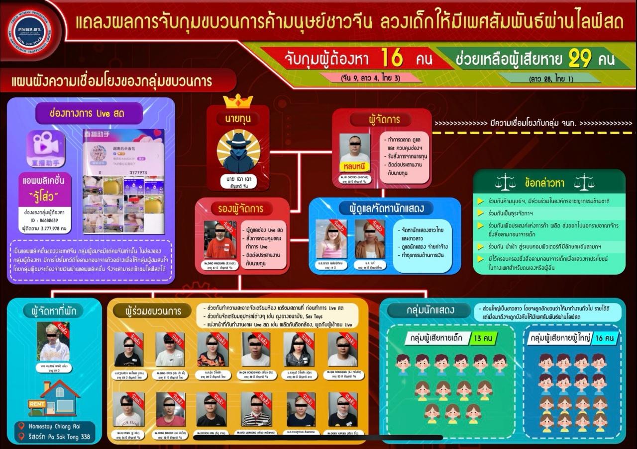จากกรณีวันที่ 26 พ.ค. ที่ผ่านมา เจ้าหน้าที่ตํารวจ สอท.4 และเจ้าหน้าที่ ตม.จว.เชียงราย เข้าตรวจค้น ณ ป่าสักทองรีสอร์ต ต.แม่กรณ์ อ.เมือง จ.เชียงราย พื้นที่ สภ.เมืองเชียงราย และเชียงราย โฮมสเตย์ รีสอร์ท ต.ดอยฮาง อ.เมือง จ.เชียงราย ที่รับผิดชอบ สภ.แม่ยาว พบกลุ่มผู้ต้องหามีการลักลอบถ่ายทอดสดการมีเพศสัมพันธ์ผ่านแอปพลิเคชันจีน โดยใช้สถานที่ดังกล่าวเป็นที่ถ่ายทํา เข้าช่วยเหลือเยาวชนซึ่งถูกบังคับให้มาแสดงเป็นชาวไทยและชาวลาว 40 คน โดยมีผู้ต้องหาซึ่งเป็นผู้จัด ให้มีการถ่ายทำ 5 คน เป็นชาวจีน 4 คนและชาวไทยอีก 1 คน