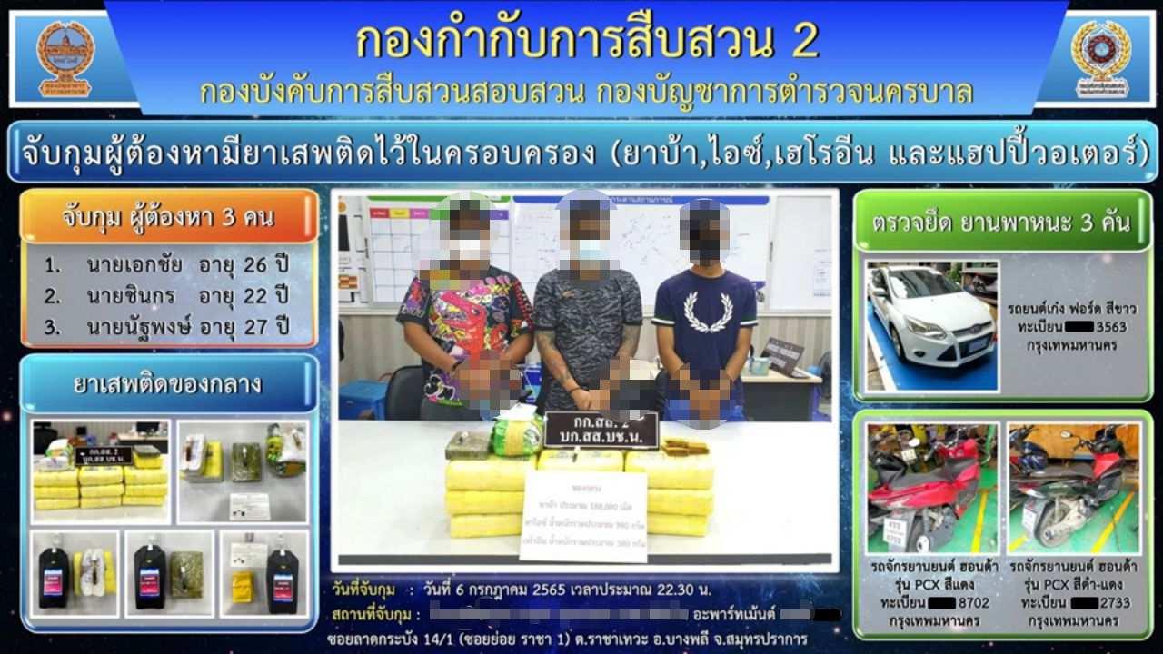 ที่กองบัญชาการตำรวจนครบาล (บช.น.) เมื่อเวลา 10.00 น. วันที่ 9 ก.ค. 2565 พล.ต.ท.สำราญ นวลมา ผบช.น. พล.ต.ต.นิธิธร จินตกานนท์ รอง ผบช.น. พ.ต.อ.ธีระชัย ชำนาญหมอ รองผบก.สส.บช.น. พ.ต.อ.กฤศณัฏฐ์ ธนศุภณัฎฐ์ ผกก.สส.2 บก.สส.บช.น. จับกุมนายเอกชัย เอกสารตรา อายุ 26 ปี นายชินกร เอกสารตรา อายุ 22 ปี สองพี่น้อง ชาวบ้านใน ซอยกาญจนาภิเษก 35 แขวงและเขตประเวศ กทม. และนายนัฐพงษ์ บูรมาตย์ อายุ 27 ปี ชาวบ้าน ซอยอ่อนนุช 49 แขวงอ่อนนุช เขตสวนหลวง กทม. ข้อหาร่วมกันจำหน่ายยาเสพติดให้โทษประเภท 1 (เมทแอมเฟตามีน) อันเป็นการมีไว้เพื่อจำหน่ายอันเป็นการกระทบต่อความมั่นคงของรัฐหรือความปลอดภัยของประชาชนทั่วไปพร้อมของกลางยาบ้า 188,000 เม็ด ยาไอซ์ 980 กรัม เฮโรอีน 380 กรัม และเมทแอมเฟตามีนชนิดผง เรียกกันว่า “happy water” จำนวน 26 ซอง น้ำหนักรวม 54 กรัม