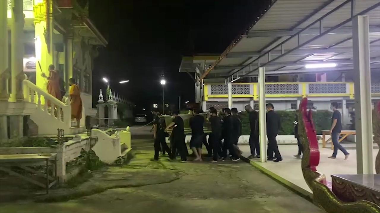 ทั้งนี้ในการสวดอภิธรรม นายรัฐพล หลังจากนำศพมาตั้งแต่ช่วงบ่ายวันนี้ ได้มีการนิมนต์พระสงฆ์จำนวน 12 รูป ทำการสวด 3 จบ เปรียบเสมือนทำการสวด 3 คืน ก่อนจะมีการทำพิธีบังสุกุลและทอดผ้าภายในศาลาการ โดยญาติได้ปิดประตูเหล็กทางเข้าออกของศาลาทุกบาน จะมีเพียงญาติๆ และคนที่รู้จักเดินทางเข้าร่วมภายในงานประมาณ 100 คน