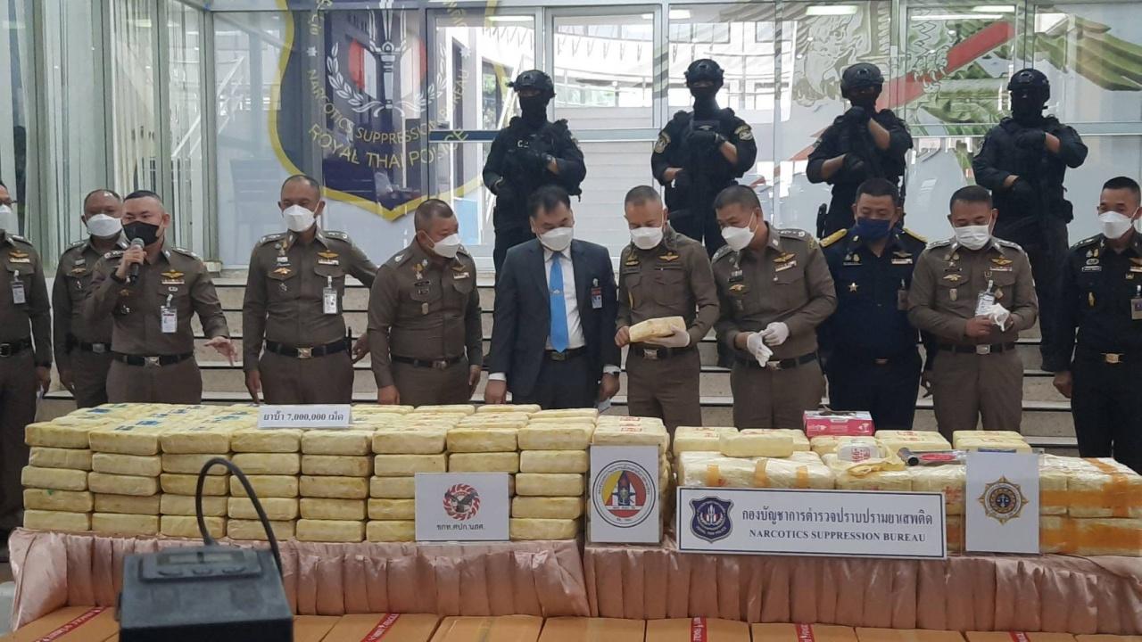 เมื่อเวลา 10.00 น. วันที่ 12 กรกฎาคม 2565 ที่ กองบัญชาการตำรวจปราบปรามยาเสพติด (บช.ปส.) พล.ต.อ.รอย อิงคไพโรจน์ รองผบ.ตร. พร้อมด้วย พล.ต.ท.สรายุทธ สงวนโภคัย ผบช.ปส. พล.ต.ต.บรรพต มุ่งชอบกลาง ผบก.ปส.3 นายมานะ ศิริพิทยาวัฒน์ รองเลขาธิการ ป.ป.ส สำนักงาน ป.ป.ส. และหน่วยงานที่เกี่ยวข้องร่วมกันแถลงข่าวจับผู้ต้องหาคดียาเสพติดรายสำคัญ จำนวน 2 คดี รวมผู้ต้องหา 5 ราย ของกลางยาบ้า 7 ล้านเม็ด และตรวจยึดทรัพย์สินมูลค่าประมาณ 112 ล้านบาท