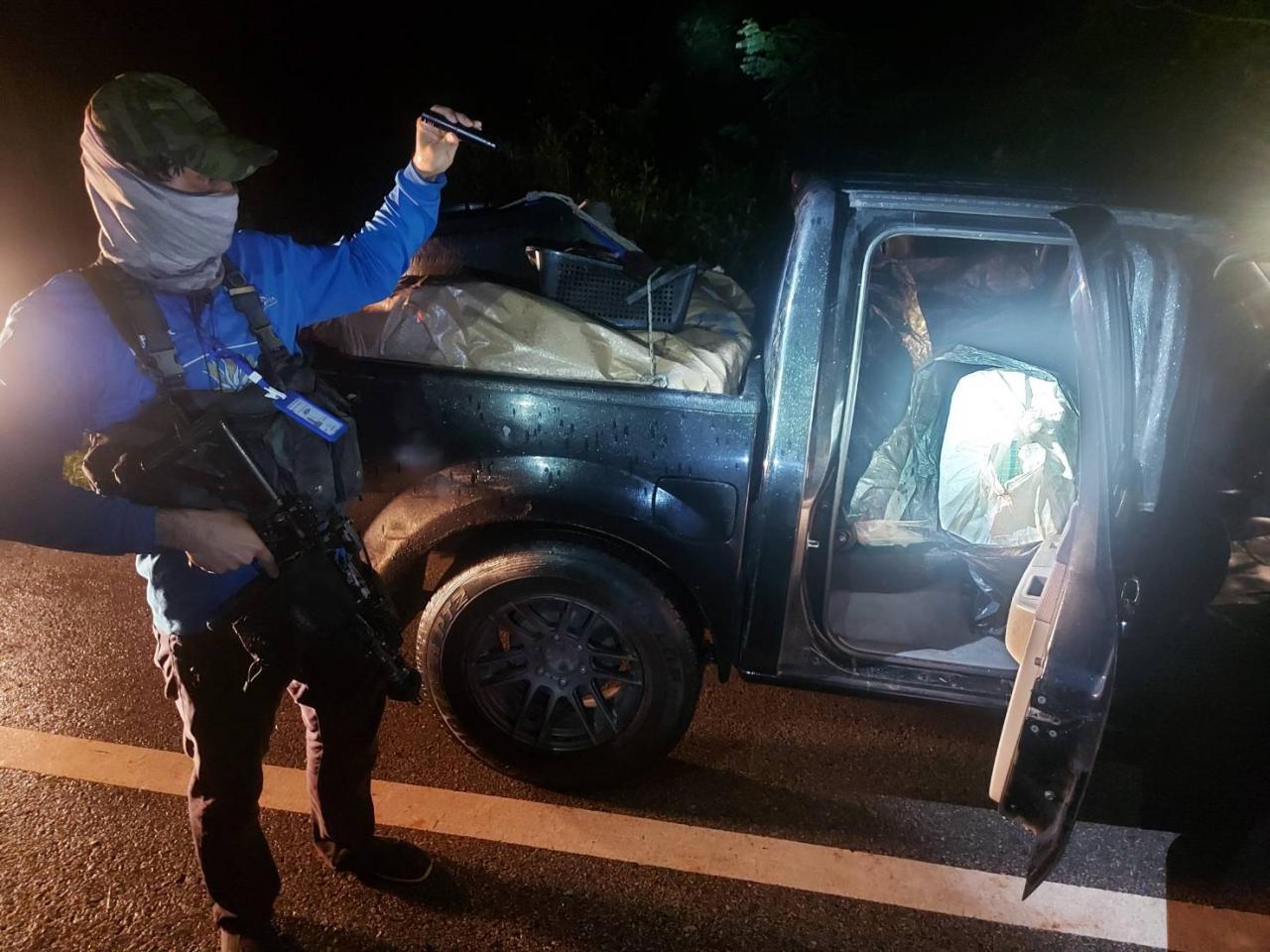 โดย พล.ร.ต.สมบัติ จูถนอม ผบ.นรข. ได้รับแจ้งจากสายลับเมื่อ 7 ก.ค. ว่า กลุ่มขบวนการจะมีการขนย้ายยาเสพติดจากริมแม่น้ำโขง อ.เมืองบึงกาฬ ไปยังตอนในของประเทศ โดยใช้รถกระบะสีดำด้านหลังมีผ้าใบปิดบังซ่อนพรางยาเสพติด จึงมอบหมายให้ น.อ.ราฆพ เทวะประทีป ผบ.นรข.เขตหนองคาย สั่งการให้ หมวดทำลายใต้น้ำจู่โจม บก.นรข. บูรณาการร่วมกับ สน.เรือบึงกาฬ โดย น.ท.การันต์ มินวงษ์ จัดกำลังเฝ้าตรวจตามริมแม่น้ำโขง กระทั่งวันที่ 9 ก.ค. เวลาประมาณ 02.50 น. ได้มีรถกระบะต้องสงสัย 1 คัน สีดำ วิ่งด้วยความเร็วสูงผ่านบริเวณจุดเฝ้าตรวจสีแยกไฟแดงเมืองบึงกาฬ โดยใช้ทางหลวงหมายเลข 212 มุ่งหน้าไปยัง อ.ปากคาด ภายในกระบะท้ายพบการบรรทุกที่ผิดสังเกตมีผ้าใบปิดปกคุม และมีการผูกรัดมัดตึงแน่นหนา จึงไล่ติดตามรถกระบะคันดังกล่าวที่ได้เร่งความเร็วสูงหลบหนี และด้วยสภาพอากาศที่มีฝนฟ้าคะนองและการซ่อมทำถนนทางหลวงหมายเลข 212 ทำให้การติดตามกระทำได้อย่างจำกัด