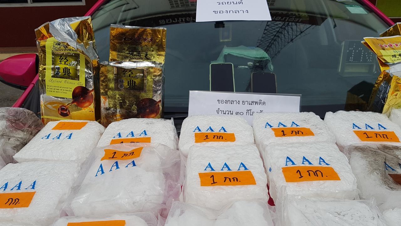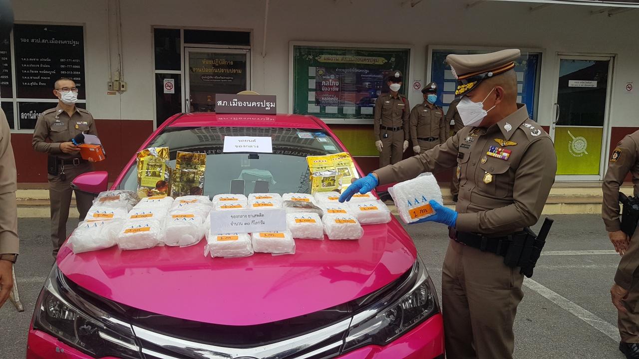 พล.ต.ท.ธนายุตม์ วุฒิจรัสธำรงค์ ผบช.ภ.7 เปิดเผว่า เมื่อวันที่ 11 สิงหาคม 2565 เวลาประมาณ 03.00 น. เจ้าหน้าที่ตำรวจ สภ.เมืองนครปฐม ได้ตั้งจุดตรวจจุดสกัดบริเวณจุดกลับรถ ศูนย์รถฮุนได ถนนเพชรเกษม ต.สระกะเทียม ขณะนั้นพบเห็นรถยนต์เก๋งแท็กซี่ สีชมพู ยี่ห้อ โตโยต้า หมายเลขทะเบียน ทฬ 2849 กทม. กำลังขับเข้ามาในด่าน เมื่อเห็น ตร.พยายามเลี่ยงรถหลบหนีแต่ ตร.เรียกให้หยุดตรวจ ปรากฏว่าบุคคลภายในรถมีท่าทางพิรุธ ซึ่งในรถนั้นมี นายสัมฤทธิ์ มะลิซ้อน เป็นคนขับรถแท็กซี่ และน.ส.จันทร์เพ็ญ ปวงสุข เป็นผู้ที่นั่งโดยสารมา เจ้าหน้าที่จึงขอตรวจค้นภายในรถ พบยาไอซ์ ใส่ถุงใส บรรจุอยู่ในถุงชา สีทอง ยี่ห้อ 888 GUANYINWANG ซุกซ่อนอยู่ลังกระดาษ 2 ลัง ซึ่งปิดด้วยเทปกาวใส ลังที่ 1 จำนวน 14 ถุง ลังที่ 2 จำนวน 16 ถุง รวม 30 ถุง หนักถุงละ 1 กิโลกรัม รวม 30 กิโลกรัม