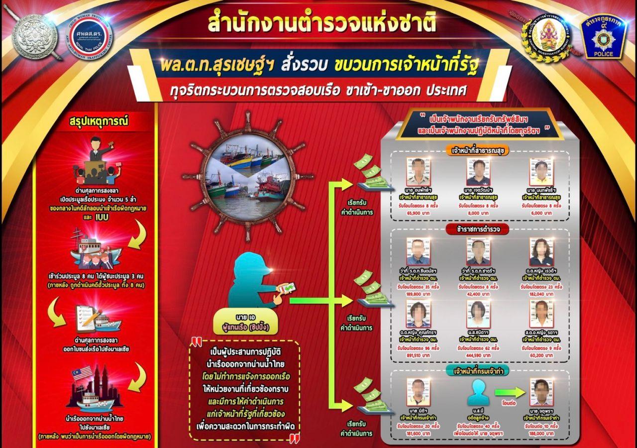 เจ้าหน้าที่ได้ดำเนินการขยายผลเพิ่มเติม จากกรณีของนายประเสริฐฯ เกี่ยวกับการลักลอบนำเรือประมงทั้ง 5 ลำ เข้าและออกจากราชอาณาจักร รวบรวมพยานหลักฐานเกี่ยวกับเส้นทางการเงินของนายประเสริฐฯ จึงได้ทราบเพิ่มเติมจากนายประเสริฐ ว่า นายประเสริฐ ได้มีการประสานงานกับเจ้าหน้าที่รัฐบางส่วน เพื่อดำเนินการเสนอผลประโยชน์ให้เจ้าหน้าที่อำนวยความสะดวก ในการขั้นตอนการตรวจเรือเข้าและออกราชอาณาจักร เจ้าหน้าที่ตำรวจจึงได้รวบรวมพยานหลักฐาน และดำเนินการยื่นขอหมายจับเจ้าหน้าที่รัฐดังกล่าว จำนวน 11 ราย
