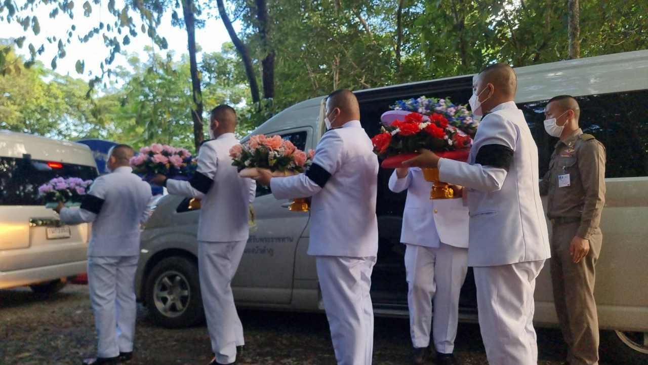 จากนั้นเวลา 16.00 น. เจ้าหน้าที่ปฏิบัติงานพิธี เชิญพวงมาลาของพระบาทสมเด็จพระเจ้าอยู่หัว และพระบรมวงศานุวงศ์ วางหน้าหีบศพผู้เสียชีวิต ก่อนมีพิธีพระราชทานน้ำหลวงอาบศพที่วัดราษฎร์สามัคคี โดยมีนางยุพา ทวีวัฒนะกิจบวร ปลัดกระทรวงวัฒนธรรม เป็นประธานในพิธี