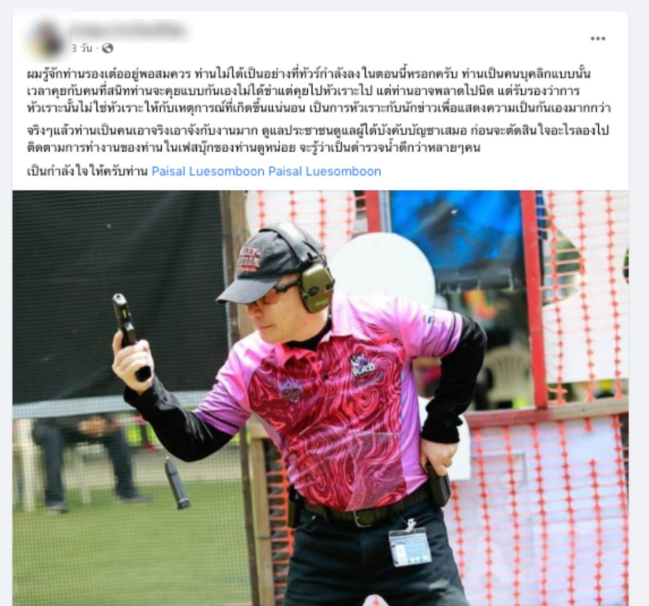 ผู้สื่อข่าวรายงานอีกว่า เฟซบุ๊กที่เข้ามาให้กำลังใจ ระบุว่า ผมรู้จักท่านรองเต๋ออยู่พอสมควร ท่านไม่ได้เป็นอย่างที่ทัวร์กำลังลงในตอนนี้หรอกครับ ท่านเป็นคนบุคลิกแบบนั้น เวลาคุยกับคนที่สนิทท่านจะคุยแบบกันเอง ไม่ได้ขำแต่คุยไปหัวเราะไป แต่ท่านอาจพลาดไปนิด แต่รับรองว่าการหัวเราะนั้นไม่ใช่หัวเราะให้กับเหตุการณ์ที่เกิดขึ้นแน่นอน เป็นการหัวเราะกับนักข่าวเพื่อแสดงความเป็นกันเองมากกว่า จริงๆ แล้วท่านเป็นคนเอาจริงเอาจังกับงานมาก ดูแลประชาชนดูแลผู้ได้บังคับบัญชาเสมอ ก่อนจะตัดสินใจอะไรลองไปติดตามการทำงานของท่านในเฟซบุ๊กของท่านดูหน่อย จะรู้ว่าเป็นตำรวจน้ำดีกว่าหลายๆ คน เป็นกำลังใจให้ครับท่าน.