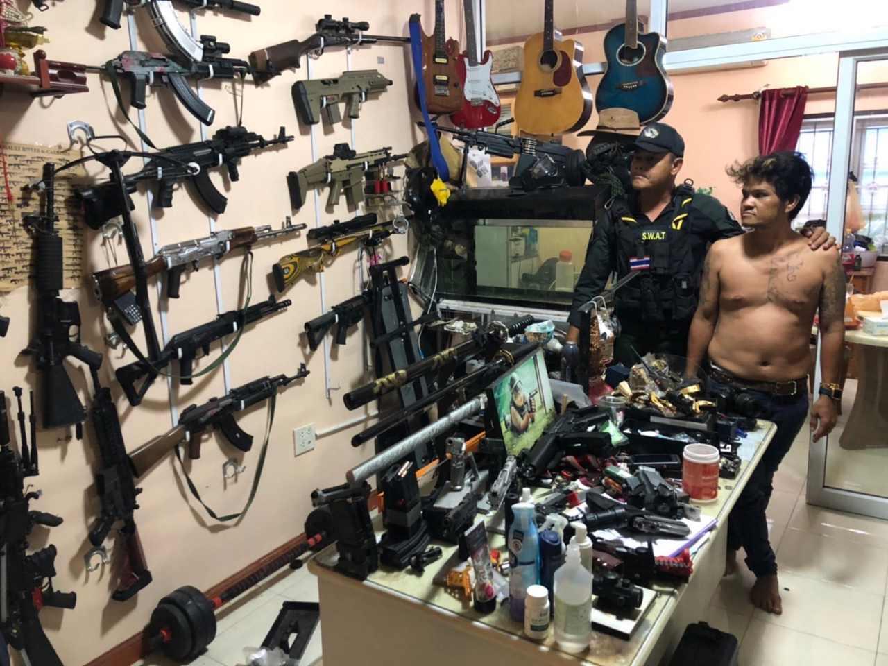 สำหรับละเอียดของคดีนี้ เมื่อเวลา 07.00 น.ที่ผ่านมา พล.ต.ต.ศรัญญู ชำนาญราช ผบก.ภ.จว.สุราษฎร์ธานี พร้อมด้วย พ.ต.อ.ไพศาล สังข์เทพ รองผบก.ภ.จว. สุราษฎร์ธานี พ.ต.อ.วัฒนา เบ้าศรี ผกก.สส.ภ.จว.สุราษฎร์ธานี พ.ต.อ.จิตปะพัทธ์ เอกโพธิ์ ผกก.ปฟ.บก.สส.ภ.8 นำกำลังเจ้าหน้าที่ตำรวจชุดสืบสวน นำหมายศาลจังหวัดสุราษฎร์ธานี เข้าตรวจค้นเป้าหมาย หลังได้รับแจ้งข้อมูลว่ามีบุคคลใช้บัญชีเฟซบุ๊ก ชื่อ ช่างแอร์สุราษฎร์ ช่างเปิ้ล (ช่างแอร์สุราษฎร์ ล้างแอร์) โพสต์ข้อความ คลิป และภาพเกี่ยวกับอาวุธปืน ในลักษณะทำใประชาชนตื่นกลัว จึงได้ทำการสืบสวน จนทราบว่าบุคคลที่ใช้บัญชีเฟซบุ๊กดังกล่าว ชื่อ นายอภิสิทธิ์ มั่งมี อายุ 42 ปี อยู่บ้านเลขที่ 169/18 หมู่ 5 ต.มะขามเตี้ย อ.เมือง จ.สุราษฎร์ธานี จึงขออนุมัติหมายศาลจังหวัดเข้าตรวจค้น 3 จุด ประกอบด้วยบ้านพักนายอภิสิทธิ์ 2 จุด และสนามซ้อมยิงปืน ซึ่งเป็นสวนปาล์มน้ำมัน