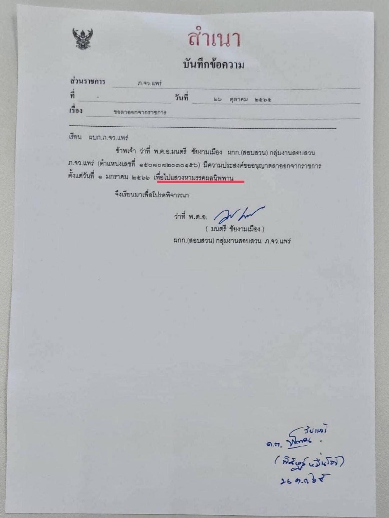 ตะลึงกันทั้งตำรวจภูธรจังหวัดแพร่ พ.ต.อ. ตำแหน่ง ผกก.(สอบสวน) กลุ่มงานสอบสวน ภ.จว.แพร่ ยื่นหนังสือขอลาออกจากการเป็นผู้พิทักษ์สันติราษฎร์ ระบุเพื่อไปแสวงหามรรคผลนิพพาน เตรียมออกบวช อยากหลุดพ้นจากการเวียนว่ายตายเกิด