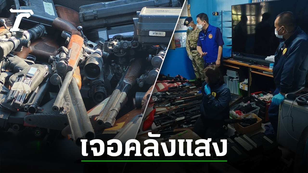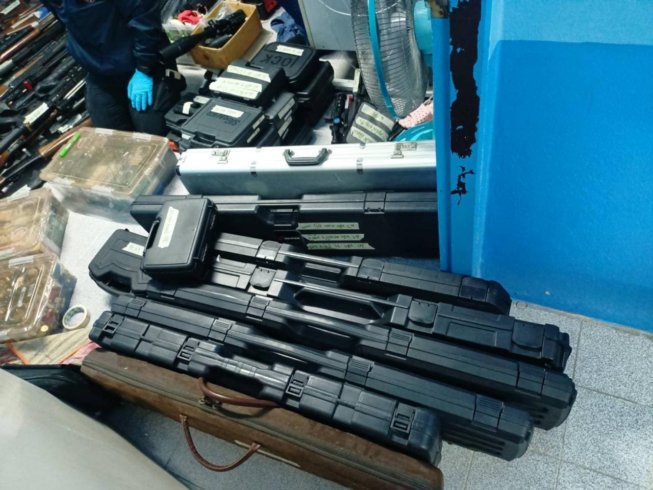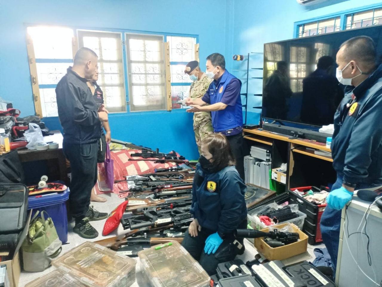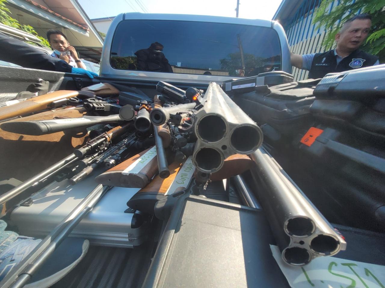 และก็ต้องตะลึง เมื่อภายในห้องนอนกลางตัวบ้านพบอาวุธปืน ทั้งปืนยาวติดลำกล้องเล็ง และปืนยาวแบบตกแต่งแล้วหลายขนาด พร้อมปืนพกสั้น รวมจำนวน 59 กระบอก โดยอาวุธปืนยาวแบบตกแต่งแล้ว บางกระบอกถูกจัดห้อยโชว์บนฝาผนังของห้องนอน และปืนบางกระบอกถูกเก็บไว้ในกล่องเก็บปืนเป็นอย่างดี