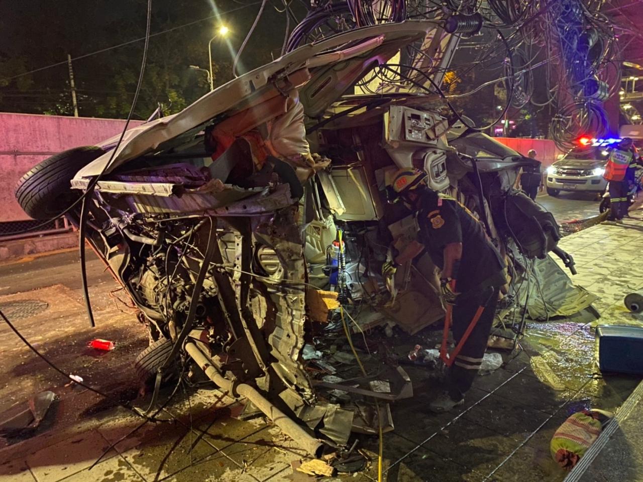 กู้ภัยงัดร่างคนขับติดคาซาก รถตู้ เมาปาดไปมา เสียหลักฟาดเสาไฟฟ้าแยกเกษตร หนุ่มไรเดอร์ขี่ตามมาเข้าช่วย ถามคนขับรถตู้บอกว่า "เมา เมา"