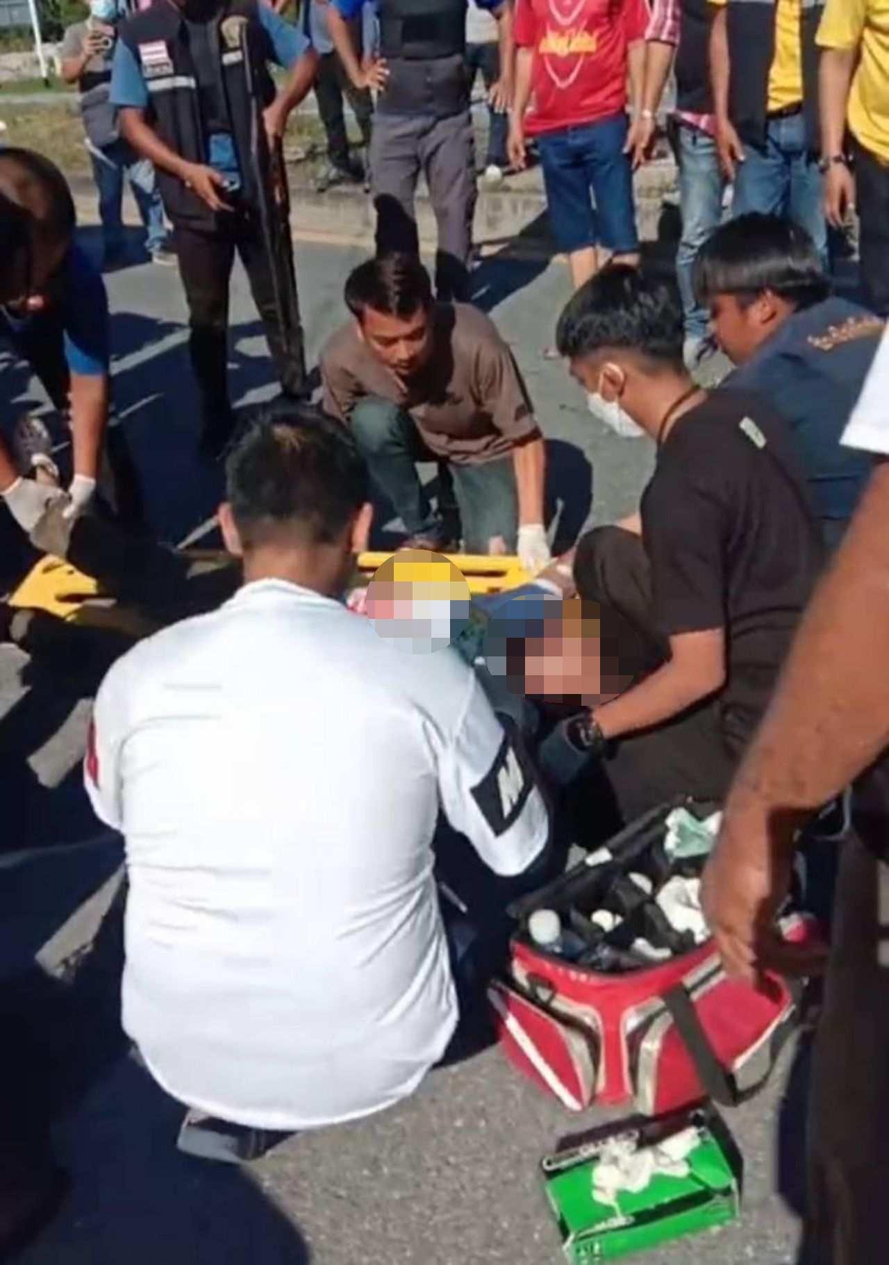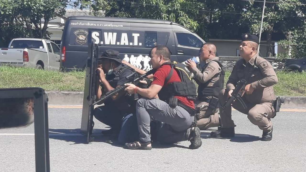 ต่อจากนั้น พล.ต.ต.สมชาย ซื่อต่อตระกูล ผบก.ภ.นครศรีธรรมราช ได้รุดเดินทางไปที่เกิดเหตุพร้อมกำลังตำรวจชุด นปพ.ชุดราชเดช กก.สส.ภ.จว.นครศรีธรรมราช ไปเจรจาปิดล้อมนานกว่า 3 ชม.ไม่เป็นผล จึงตัดสินใจสั่งการให้ นปพ.พร้อมโล่กำบังเข้าไปใกล้ที่รถกระบะคันดังกล่าว เพื่อเข้าชาร์จแต่ไม่เป็นผล คนร้ายได้ใช้ปืนยิงสวนใส่ตำรวจชุดดังกล่าวถูกโล่และกระสุนนัดหนึ่งยิงถูกนิ้วชี้ มือขวาของ ด.ต.สุธี พาหุกาญจน์ อายุ 51 ปี ผบ.หมู่ กก.สส.ภ.จว.นครศรีธรรมราชจำนวน 1 นัด จนเอ็นนิ้วชี้ขาด เลือดสาด กำลังตำรวจชุดังกล่าวต้องถอยออกมาเพื่อตั้งหลักใหม่ และนำตัว ด.ต.สุธี ส่ง รพ.หัวไทร เพื่อรักษาบาดแผล