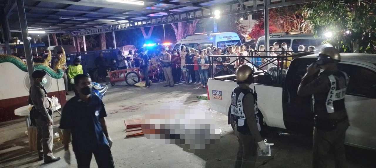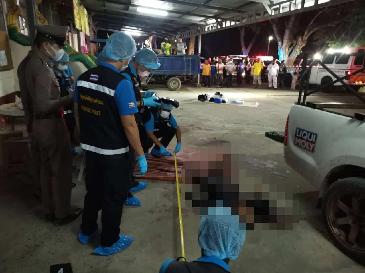 ที่เกิดเหตุพบร่างผู้เสียชีวิตอยู่ในสภาพนอนหงาย เลือดท่วมตัวอยู่บริเวณหน้าหอฉันภายในวัด ทราบชื่อผู้เสียชีวิตคือ นายธีรยุทธ ตุมร อายุ 32 ปี ชาวบ้าน หมู่ที่ 18 ต.หัวขวาง อ.โกสุมพิสัย จ.มหาสารคาม สภาพศพสวมเสื้อแขนยาวคอปกสีดำ ใส่กางเกงยีนส์ขาสั้น มีบาดแผลถูกแทงด้วยมีดบริเวณคอด้านซ้ายเป็นเหตุทำให้เสียชีวิต ส่วนผู้ก่อเหตุทราบชื่อคือ นายบรรเจิด ยิ้มช้อย อายุ 36 ปี ชาวบ้าน ต.บางกระสอ อ.เมือง จ.นนทบุรี หลบหนีไปก่อนหน้านี้แล้ว ตำรวจจึงให้เจ้าหน้าที่กู้ภัยนำศพส่งให้แพทย์ชันสูตรที่นิติเวช รพ.มหาวิทยาลัยนเรศวร ก่อนติดต่อญาติให้มารับศพไปบำเพ็ญกุศลตามประเพณี
