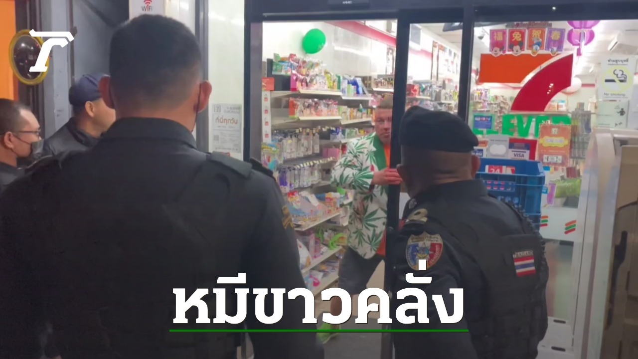 สอบถามพนักงานร้านสะดวกซื้อ ทราบว่าชาวต่างชาติได้เข้ามาหยิบน้ำดื่ม เลือกและรื้อสินค้า ก่อนลวนลามลูกค้าแล้ววิ่งพุ่งชนกระจกจนแตก ส่วนวิน จยย.รับจ้าง เล่าว่า พนักงานร้านสะดวกซื้อร้องให้เข้าไปช่วย ว่ามีชาวต่างชาติเมาอาละวาดในร้าน จึงพากันไปช่วย แต่ถูกชายต่างชาติผู้นี้ใช้หัวโขกจนได้รับบาดเจ็บ เมื่อดูว่าสถานการณ์ไม่ดี จึงแจ้งเจ้าหน้าที่ช่วยกันจับตัวดังกล่าว