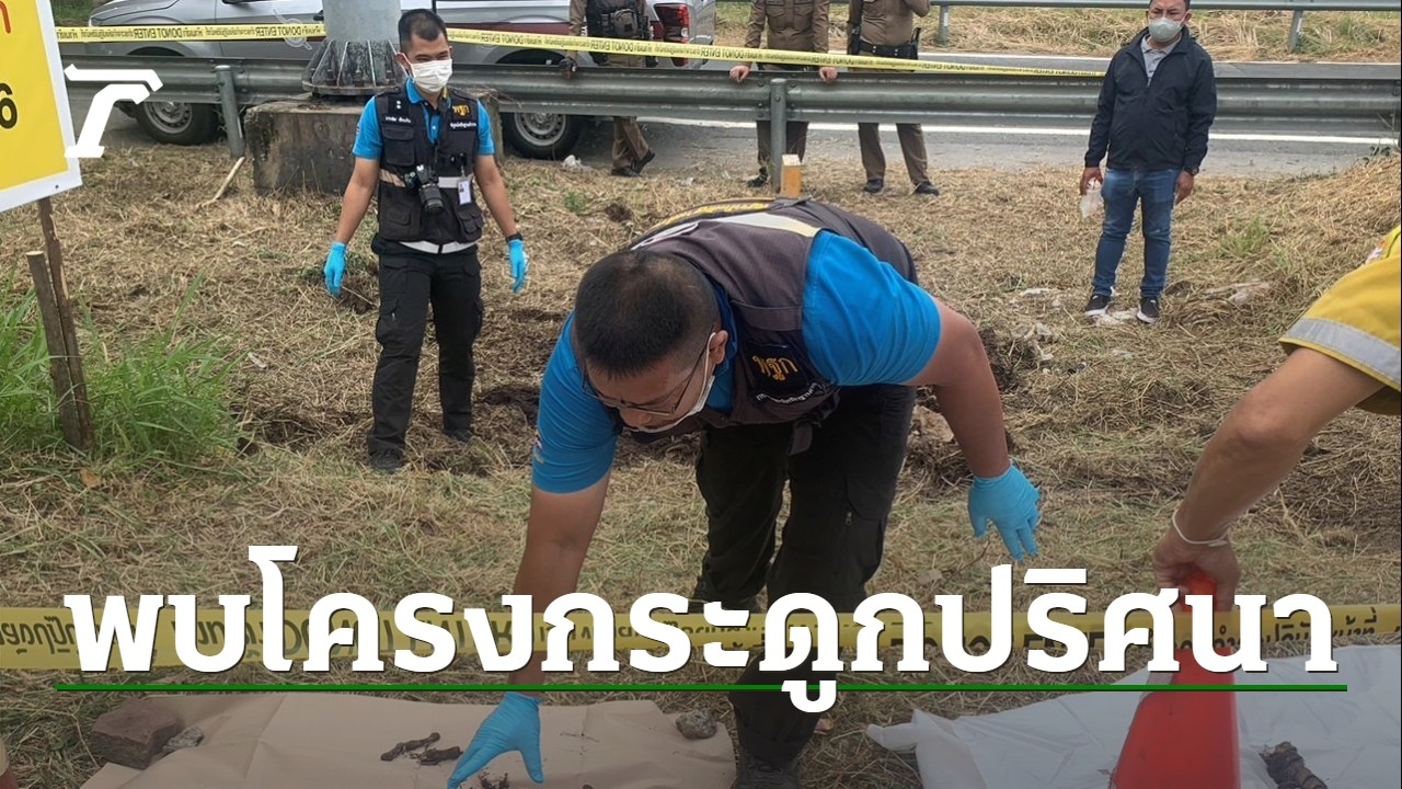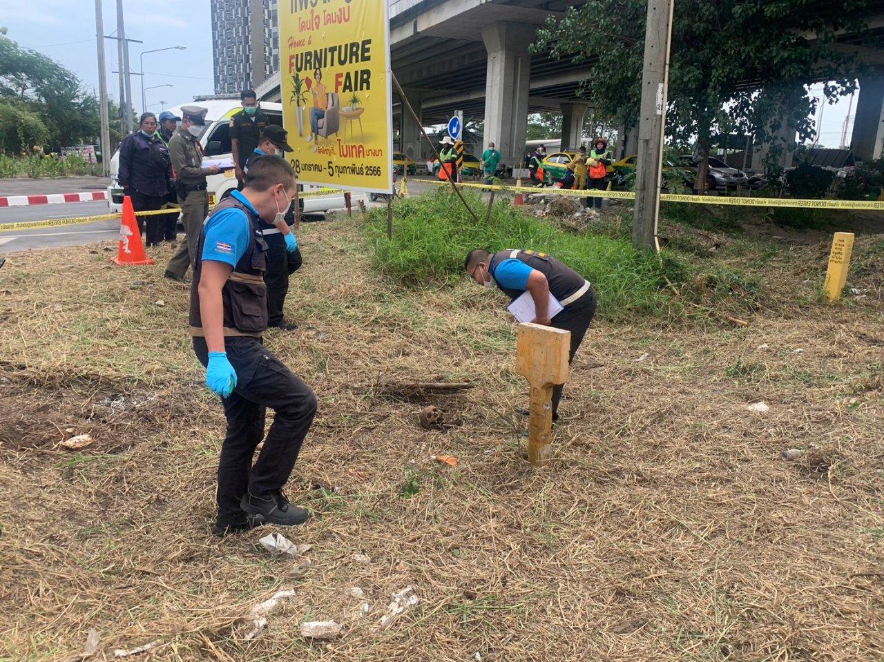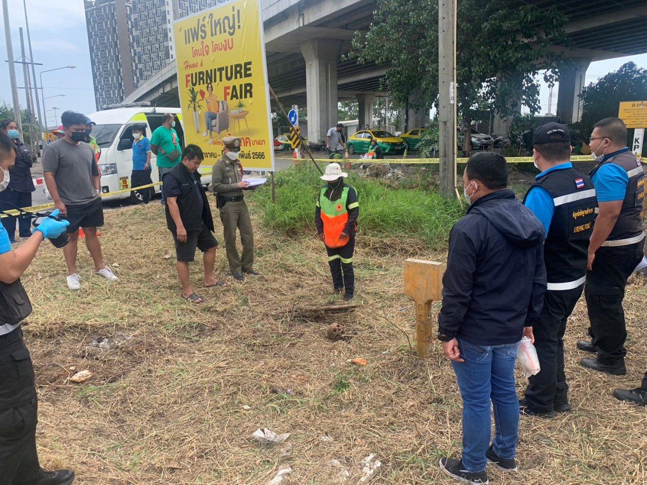 เจ้าหน้าที่เขตคันนายาวตัดหญ้าริมไหล่ทางถนนกาญจนาฯ พบชิ้นส่วนโครงกระดูกปริศนาโผล่ ตกใจรีบแจ้งตำรวจ สน.บางชัน เข้าตรวจสอบ พฐ.เข้าเก็บหลักฐาน ขุดซากทั้งหมดส่งตรวจสอบที่ นิติเวช รพ.ตำรวจ