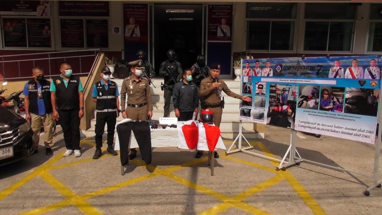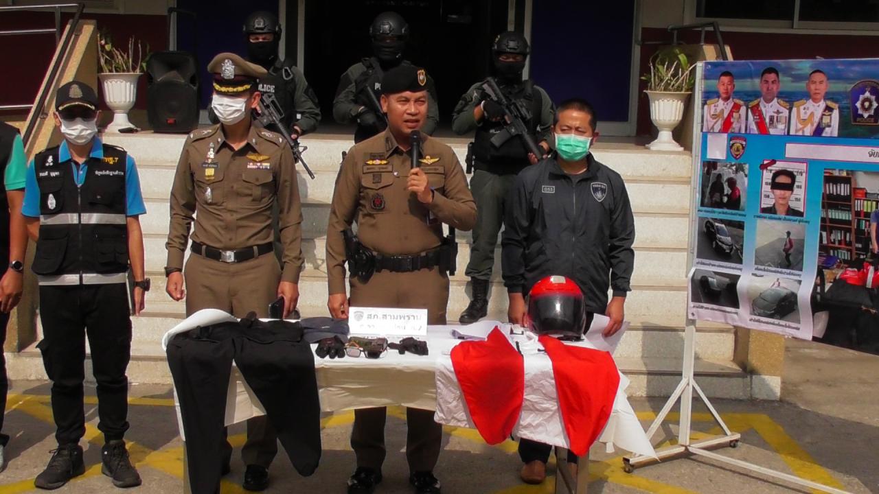 เมื่อเวลา 09.00 น. วันที่ 18 มี.ค. 66 ที่สภ.สามพราน จ.นครปฐม พ.ต.อ.พงษกร อุปพงษ์ รอง ผบก.ภ.จว.นครปฐม พ.ต.อ.ทรงวุฒิ เจริญวิชยเดช ผกก.สภ.สามพราน พร้อมชุดสืบสวน ร่วมกันแถลงข่าวการจับกุม นายธีรพล หรือกอล์ฟ เส็งสมวงศ์ อายุ 40 ปี อยู่บ้านเลขที่ 359/40 ถนนอิสรภาพ แขวงบ้านช่างหล่อ เขตบางกอกน้อย กรุงเทพฯ ผู้ต้องหาเหตุคนร้ายใช้อาวุธปืนจี้ที่ร้านทองเยาวราชเอ็มโกลด์ ถนนเข้าอำเภอสามพราน หมู่ 1 ต.ท่าตลาด อ.สามพราน จ.นครปฐม ตามหมายจับศาลจังหวัดนครปฐมที่ 175/2566 ลงวันที่ 17 มีนาคม 2566 จับกุมตัวได้ที่ ที่พักคอนโดมิเนียม ถนนอิสรภาพ แขวงบ้านช่างหล่อ เขตบางกอกน้อย กรุงเทพฯ พร้อมด้วยของกลาง สิ่งเทียม อาวุธปืน 1 กระบอก พบอยู่บนรถคันก่อเหตุ หมายเลขทะเบียน 1 กย 306 กทม. ชุดเสื้อผ้า กางเกงไปรษณีย์ ใส่ถุงซุกซ่อนไว้ชั้นใต้ดิน อาคารที่พัก และหมวกนิรภัยสัญลักษณ์ไปรษณีย์ พบอยู่บนรถยนต์