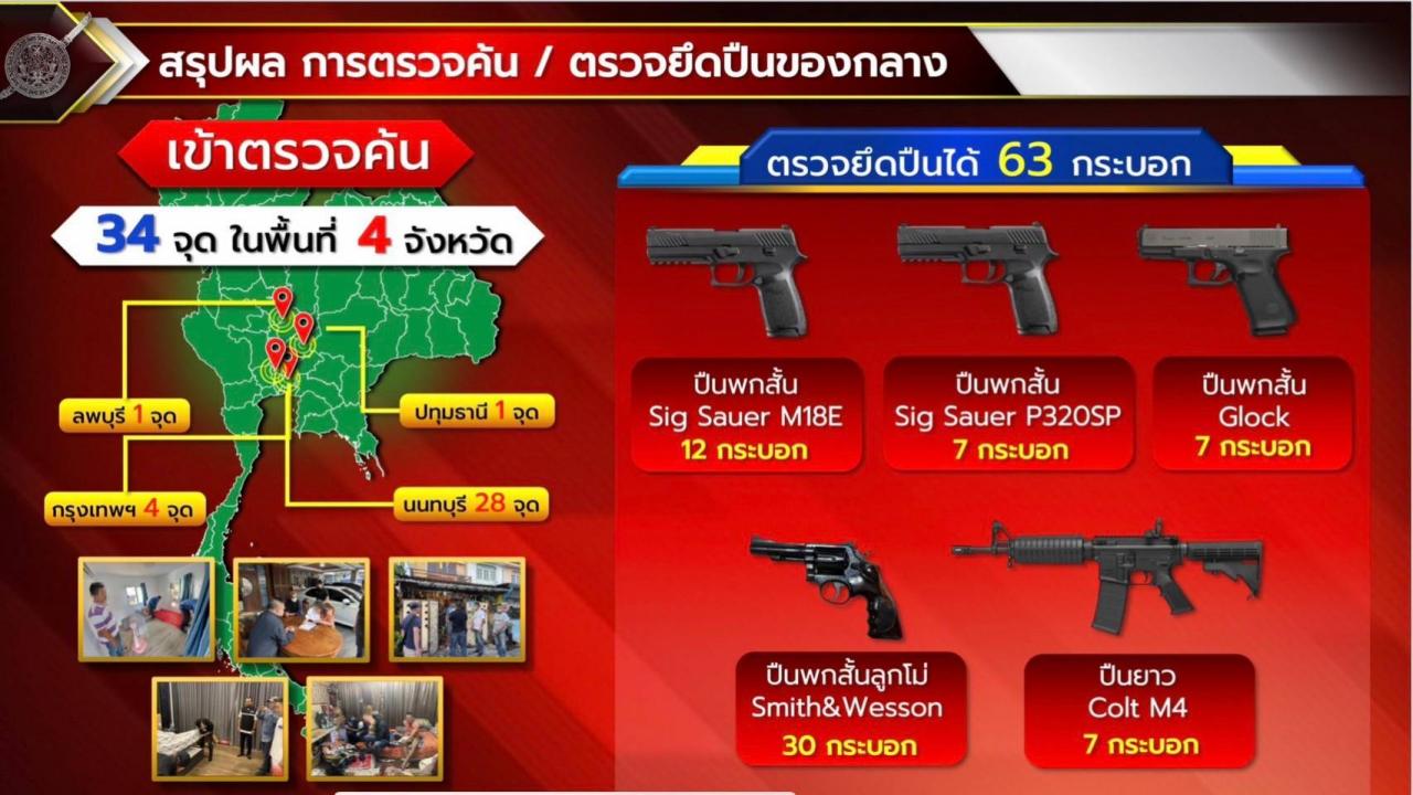 ในส่วนของอาวุธปืนหลวงที่ถูกลักไปนั้น เจ้าหน้าที่ตำรวจขออนุมัติหมายค้นจากศาลเพื่อเข้าค้นตรวจยึดหาพยานหลักฐานและติดตามอาวุธปืนหลวงซึ่งหายไป 160 กระบอก ติดตามคืนมาได้แล้ว 64 กระบอก ทีเหลืออีก 96 กระบอก อยู่ระหว่างติดตามค้นหาต่อไป สำนวนคดีนี้ประกอบด้วยเอกสารมากกว่า 2,200 แผ่น สอบปากคำพยาน 30 ปาก ขณะนี้อยู่ระหว่างเสนอผู้บังคับบัญชาลงนามพิจารณาสั่งฟ้อง เพื่อส่งสำนวนเสนอพนักงานอัยการต่อไป