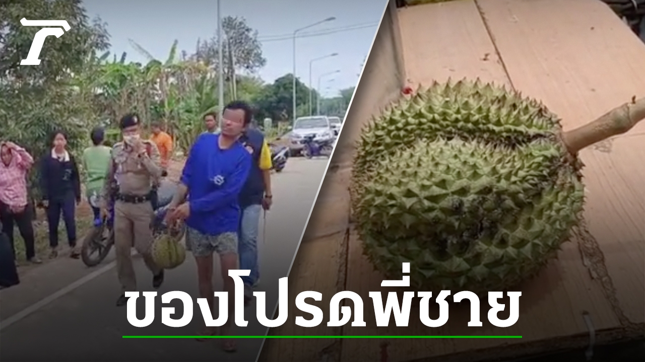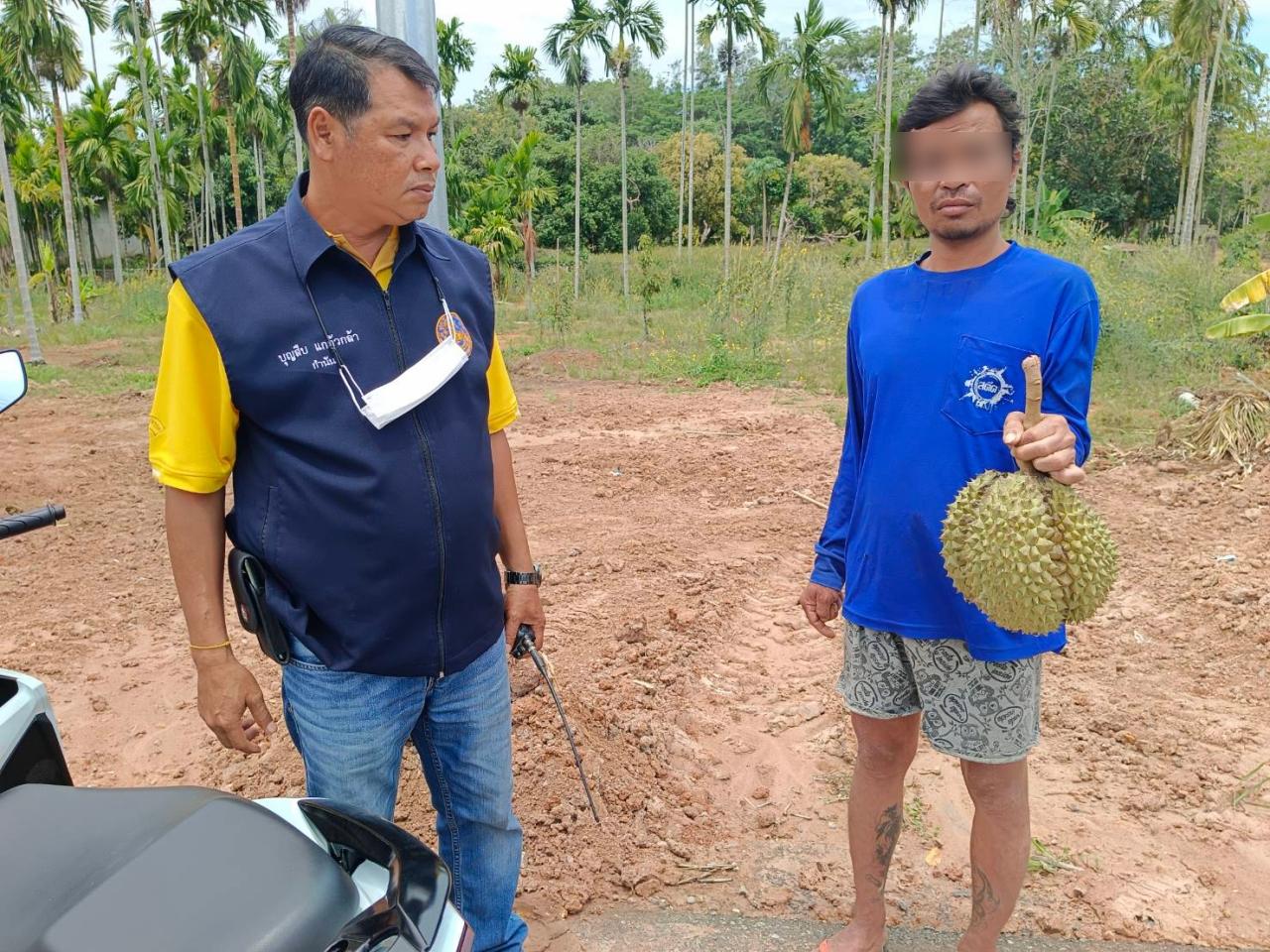 หนุ่มขี่ จยย.ผ่านสวนทุเรียน เห็นหมอนทองลูกสวย อยากได้ไปฝากพี่ชาย จึงเข้าไปตัดเอามา 1 ลูก ทั้งที่เป็นสวนคนอื่น สุดท้ายไม่รอด เจ้าของเห็นพอดี เรียกชาวบ้านจับส่งตำรวจทันควัน