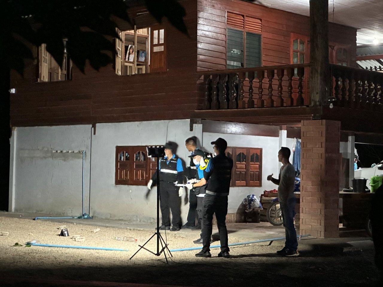 จากการตรวจสอบของเจ้าหน้าที่ตำรวจพบว่า จุดแรกที่รั้วประตูหน้ามีปลอกกระสุนปืนขนาด 5.56 มม.ของคนร้ายประมาณ 10 ปลอก ห่างประตูรั้วเข้าไปประมาณ 15-20 เมตรเป็นตัวบ้านพักพบประตูหน้าต่างบ้านถูกกราดยิงนับหลายสิบนัด กระจกหน้าต่างแตกกระจาย